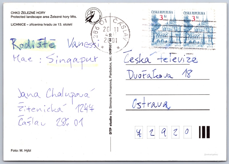 Hrad Lichnice Pokud chcete vidět pohlednice ve vyšším rozlišení nebo zobrazovat jejich zadní stranu, tak se prosím nejdříve přihlašte Přihlásit Zaregistrovat Lichnice CHKO ŽELEZNÉ HORYProtected landscape area Železné hory Mts.LICHNICE - zřícenina hradu ze 13. století Jazyky tištěného textu na pohlednici: čeština, angličtina Zřícenina hradu Lichnice, Zřícenina, Třemošnice - Podhradí, Česko ukázat na mapě Vydavatel: DTP studio Ing. Simona Formanová (Česko) Odhadované datum vydání pohlednice: 1998 - 2001 Pomozte nám zpřesnit rok vzniku pohlednice Velikost (š x v) a tvar pohlednice: 146 x 104 mm (5.75" x 4.09"), obdélník Osoby spjaté s touto pohlednicí: M. Hýbl(Autor fotografie) Prošlá poštou:Datum na razítku: 26.11.2001 Ceny: Vyplacené známky: 6,00 Kčs (CSK) DiskuseVložit příspěvek Přidat novou složku ... Spravovat složky ...