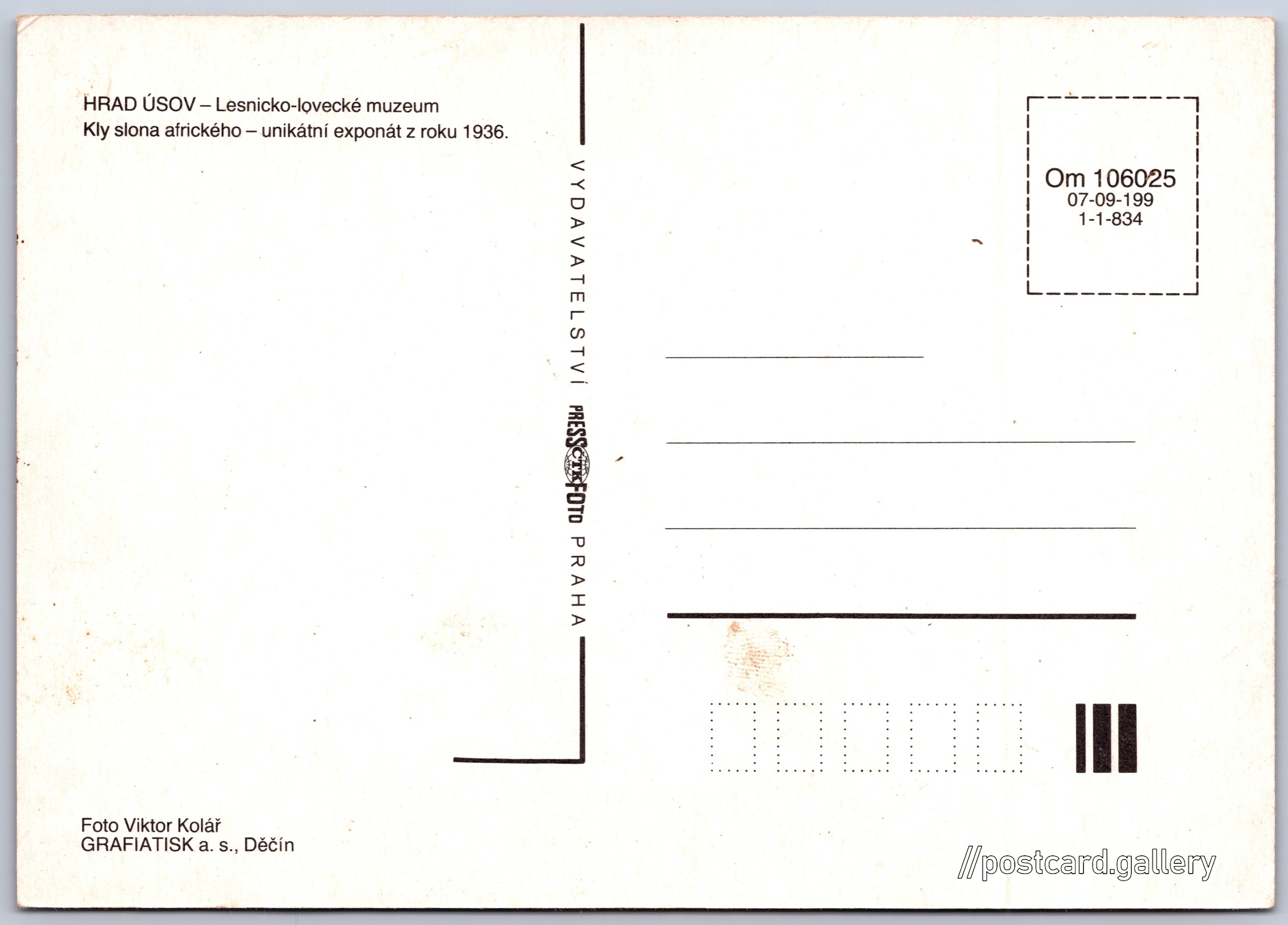 Hrad Úsov, lesnicko-lovecké muzeum Pokud chcete vidět pohlednice ve vyšším rozlišení nebo zobrazovat jejich zadní stranu, tak se prosím nejdříve přihlašte Přihlásit Zaregistrovat HRAD ÚSOV - Lesnicko-lovecké muzeumKly slona afrického - unikátní exponát z roku 1936. Jazyk tištěného textu na pohlednici: čeština Zámek Úsov, Zámek, Zámecká 1, Úsov, Česko ukázat na mapě Vydavatel: PressFoto Praha (Československo) Rok vydání pohlednice: 1991 Velikost (š x v) a tvar pohlednice: 148 x 105 mm (5.83" x 4.13"), obdélník Osoby spjaté s touto pohlednicí: Viktor Kolář(Autor fotografie) Čistá pohlednice (neprošlá poštou) Kódy na pohlednici: Om 106025 07-09-199 1-1-834 DiskuseVložit příspěvek Přidat novou složku ... Spravovat složky ...