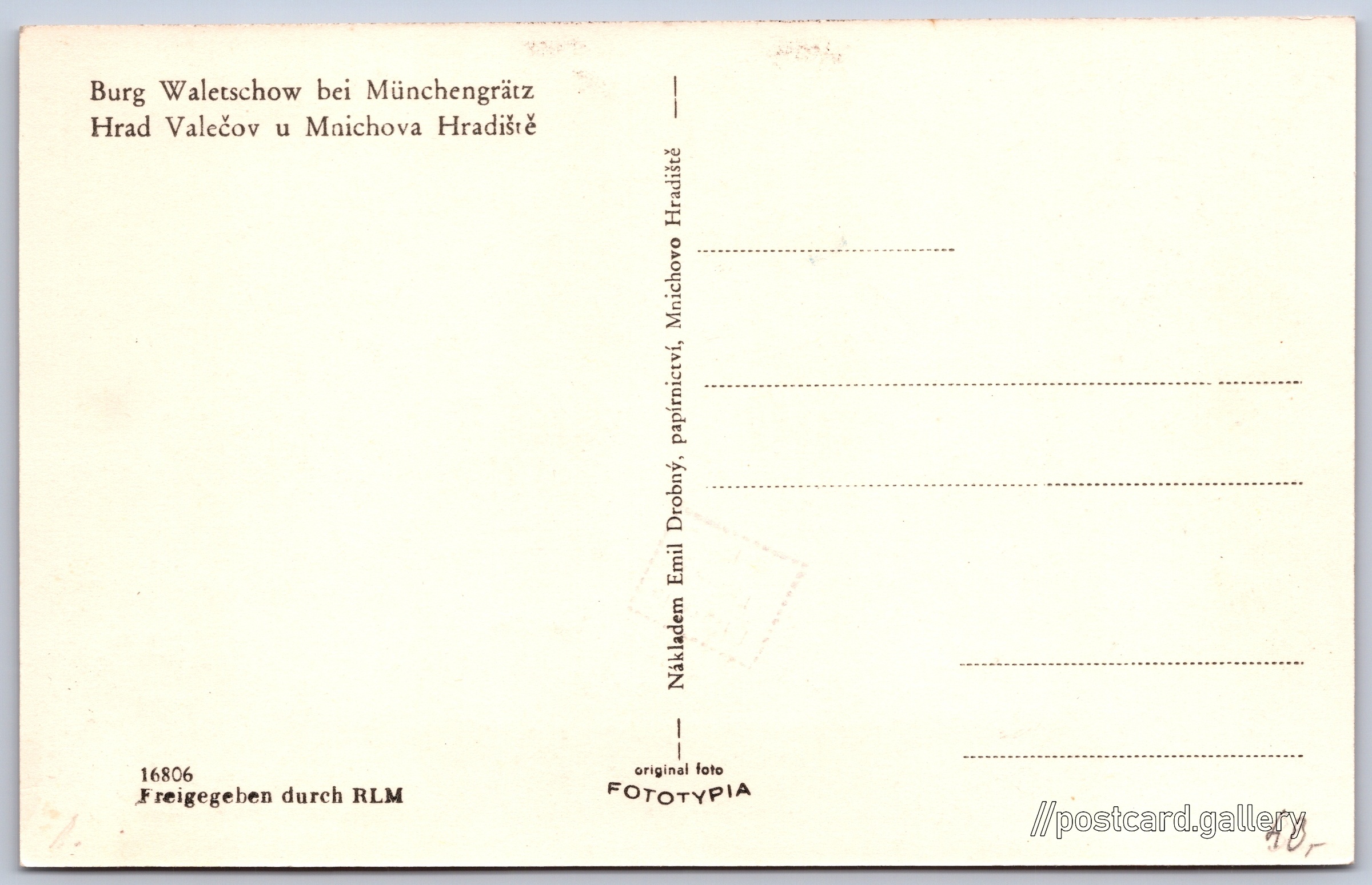 Hrad Valečov u Mnichova Hradiště Pokud chcete vidět pohlednice ve vyšším rozlišení nebo zobrazovat jejich zadní stranu, tak se prosím nejdříve přihlašte Přihlásit Zaregistrovat Burg Waletschow bei MünchengrätzHrad Valečov u Mnichova HradištěFreigegeben durch RLM Jazyky tištěného textu na pohlednici: němčina, čeština Zřícenina skalního hradu Valečov, Zřícenina, Boseň, Česko ukázat na mapě V blízkém okolí místa zobrazeného na pohlednici lze najít 1 jinou pohlednici. Zobrazit blízké pohlednice Vydavatel: Fototypia - Vyškov (Československo)Emil Drobný, papírnictví (Československo) Datum vydání není známo Pomozte nám odhadnout datum vzniku pohlednice Velikost (š x v) a tvar pohlednice: 139 x 88 mm (5.47" x 3.46"), obdélník Čistá pohlednice (neprošlá poštou) Kódy na pohlednici: 16806 DiskuseVložit příspěvek Přidat novou složku ... Spravovat složky ...