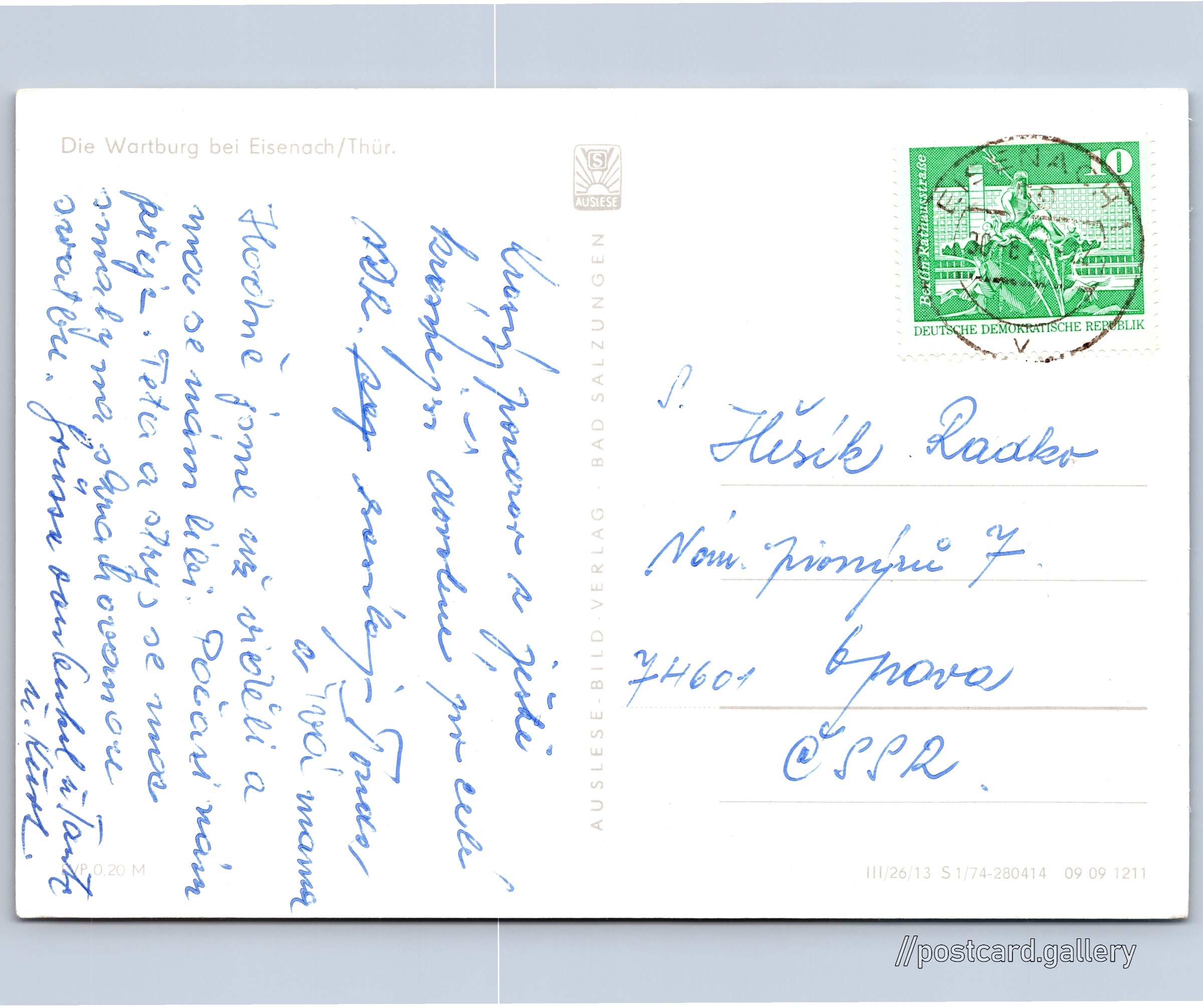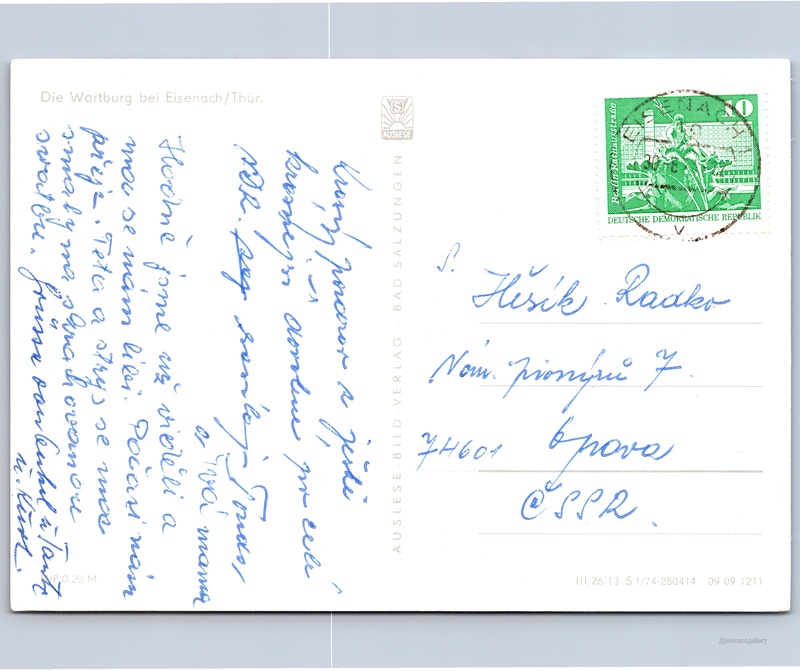 Hrad Wartburg Pokud chcete vidět pohlednice ve vyšším rozlišení nebo zobrazovat jejich zadní stranu, tak se prosím nejdříve přihlašte Přihlásit Zaregistrovat Die Wartburg bei Eisenach/Thür. Jazyk tištěného textu na pohlednici: němčina Wartburg, Hrad, Auf der Wartburg 1, Eisenach, spolková země Durynsko, Německo ukázat na mapě V blízkém okolí místa zobrazeného na pohlednici lze najít 1 jinou pohlednici. Zobrazit blízké pohlednice Datum vydání není známo Pomozte nám odhadnout datum vzniku pohlednice Velikost (š x v) a tvar pohlednice: 147 x 105 mm (5.79" x 4.13"), obdélník Prošlá poštou Ceny: Cena pohlednice: 0,20 M (MDN)Vyplacené známky: 0,10 M (MDN) Kódy na pohlednici: III/26/13 S 1/74-280414 09 09 1211 DiskuseVložit příspěvek Přidat novou složku ... Spravovat složky ...