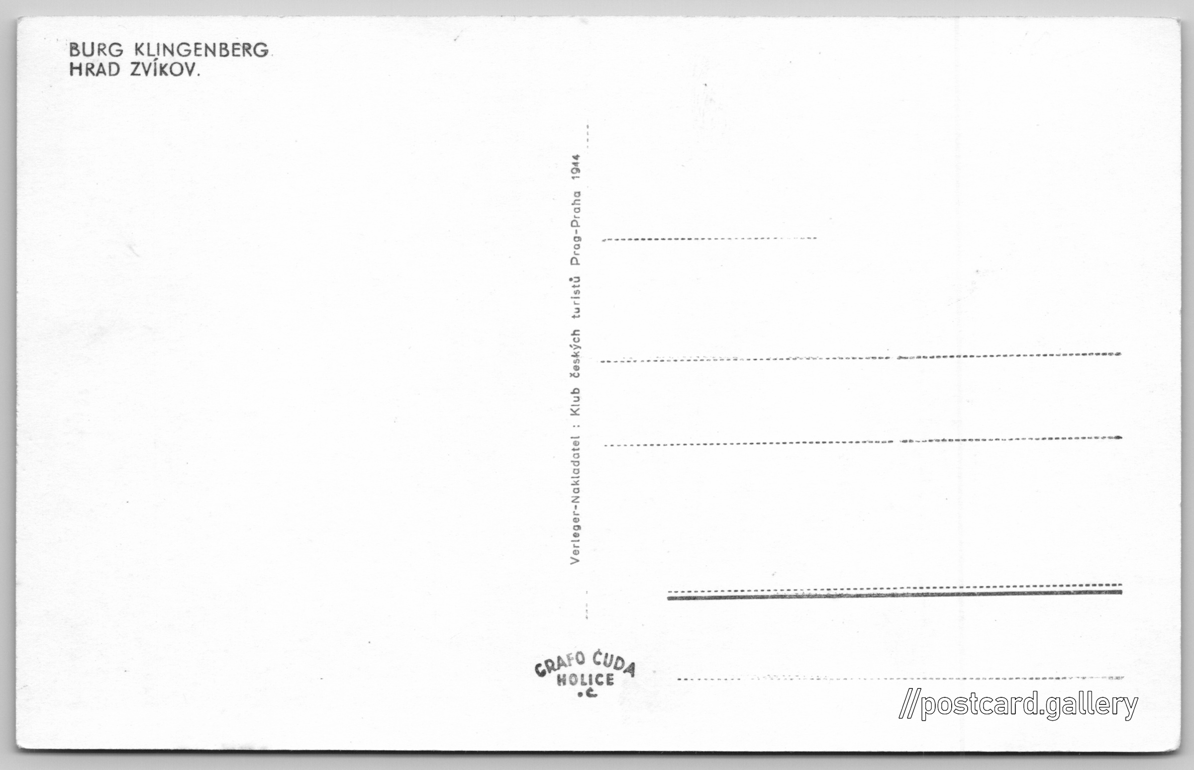 Hrad Zvíkov Pokud chcete vidět pohlednice ve vyšším rozlišení nebo zobrazovat jejich zadní stranu, tak se prosím nejdříve přihlašte Přihlásit Zaregistrovat BURG KLINGENBERG.HRAD ZVÍKOV. Jazyky tištěného textu na pohlednici: němčina, čeština Varta, Jickovice, Písek ukázat na mapě Vydavatel: Klub českých turistů (Československo)Grafo Čuda Holice (Československo) Rok vydání pohlednice: 1944 Velikost (š x v) a tvar pohlednice: 137 x 87 mm (5.39" x 3.43"), obdélník Čistá pohlednice (neprošlá poštou) DiskuseVložit příspěvek Přidat novou složku ... Spravovat složky ...