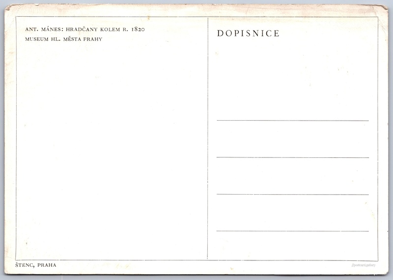 Hradčany, obraz Antonína Mánese Pokud chcete vidět pohlednice ve vyšším rozlišení nebo zobrazovat jejich zadní stranu, tak se prosím nejdříve přihlašte Přihlásit Zaregistrovat ANT. MÁNES: HRADČANY KOLEM R. 1820MUSEUM HL. MĚSTA PRAHYŠTENC, PRAHADOPISNICE Jazyk tištěného textu na pohlednici: čeština Pražský hrad, Hrad, Hrad III. nádvoří, Praha, Česko ukázat na mapě V blízkém okolí místa zobrazeného na pohlednici lze najít 159 jiných pohlednic. Zobrazit blízké pohlednice Vydavatel: Štenc (Československo) Datum vydání není známo Pomozte nám odhadnout datum vzniku pohlednice Velikost (š x v) a tvar pohlednice: 148 x 104 mm (5.83" x 4.09"), obdélník Osoby spjaté s touto pohlednicí: Antonín Mánes(Autor předlohy) Čistá pohlednice (neprošlá poštou) DiskuseVložit příspěvek Přidat novou složku ... Spravovat složky ...