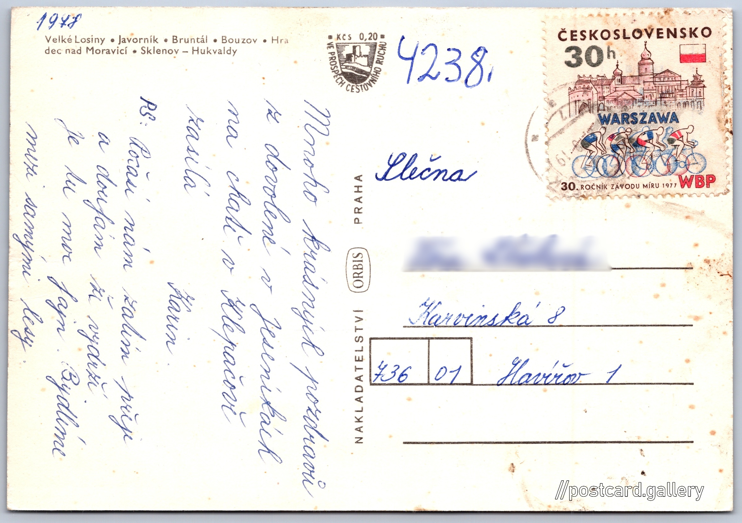 Hrady a zámky v Severomoravském kraji Pokud chcete vidět pohlednice ve vyšším rozlišení nebo zobrazovat jejich zadní stranu, tak se prosím nejdříve přihlašte Přihlásit Zaregistrovat Hrady a zámky v Severomoravském kraji - Velké Losiny- Javorník- Bruntál- Bouzov- Hradec nad Moravicí- Sklenov - Hukvaldy Jazyk tištěného textu na pohlednici: čeština Zámek Velké Losiny, Zámek, Velké Losiny, Česko ukázat na mapě Vydavatel: Nakladatelství Orbis (Československo) Odhadované datum vydání pohlednice: 1975 - 1977 Pomozte nám zpřesnit rok vzniku pohlednice Velikost (š x v) a tvar pohlednice: 149 x 103 mm (5.87" x 4.06"), obdélník Prošlá poštou Ceny: Příplatek na tur. ruch: 0,20 Kčs (CSK))Vyplacené známky: 0,30 Kčs (CSK) DiskuseVložit příspěvek Přidat novou složku ... Spravovat složky ...