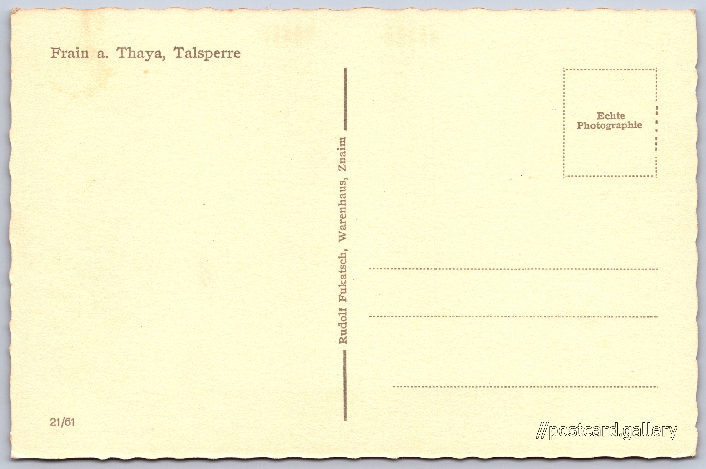 Hráz Vranovské přehrady Pokud chcete vidět pohlednice ve vyšším rozlišení nebo zobrazovat jejich zadní stranu, tak se prosím nejdříve přihlašte Přihlásit Zaregistrovat Frain a. Thaya, TalsperreEchte Photographie Jazyk tištěného textu na pohlednici: němčina Hráz vodní nádrže Vranov, Hráz, Bítovská, Vranov nad Dyjí, Česko ukázat na mapě V blízkém okolí místa zobrazeného na pohlednici lze najít 20 jiných pohlednic. Zobrazit blízké pohlednice Vydavatel: Rudolf Fukatsch, Warenhaus (Československo) Datum vydání není známo Pomozte nám odhadnout datum vzniku pohlednice Velikost (š x v) a tvar pohlednice: 139 x 92 mm (5.47" x 3.62"), obdélník, zoubkovaný Čistá pohlednice (neprošlá poštou) Kódy na pohlednici: 21/61 DiskuseVložit příspěvek Přidat novou složku ... Spravovat složky ...