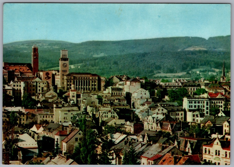 Jablonec nad Nisou, pohled na město Pokud chcete vidět pohlednice ve vyšším rozlišení nebo zobrazovat jejich zadní stranu, tak se prosím nejdříve přihlašte Přihlásit Zaregistrovat Ukázat zadní stranu pohlednice JABLONEC nad NisouČástečný pohled na město, kterému vévodí charakteristická budova jablonecké radnice. Jazyk tištěného textu na pohlednici: čeština Magistrát města Jablonec nad Nisou, Mírové náměstí 3100/19, Jablonec nad Nisou, Česko ukázat na mapě Vydavatel: Nakladatelství Orbis (Československo) Odhadované datum vydání pohlednice: 1964 - 1967 Pomozte nám zpřesnit rok vzniku pohlednice Velikost (š x v) a tvar pohlednice: 147 x 104 mm (5.79" x 4.09"), obdélník Osoby spjaté s touto pohlednicí: Zdeněk Menec(Autor fotografie) Prošlá poštou:Datum na razítku: 18.7.1967Datum napsání pohledu: 18.7.1967 Ceny: Příplatek na tur. ruch: 0,20 Kčs (CSK))Vyplacené známky: 0,30 Kčs (CSK) DiskuseVložit příspěvek Přidat novou složku ... Spravovat složky ...