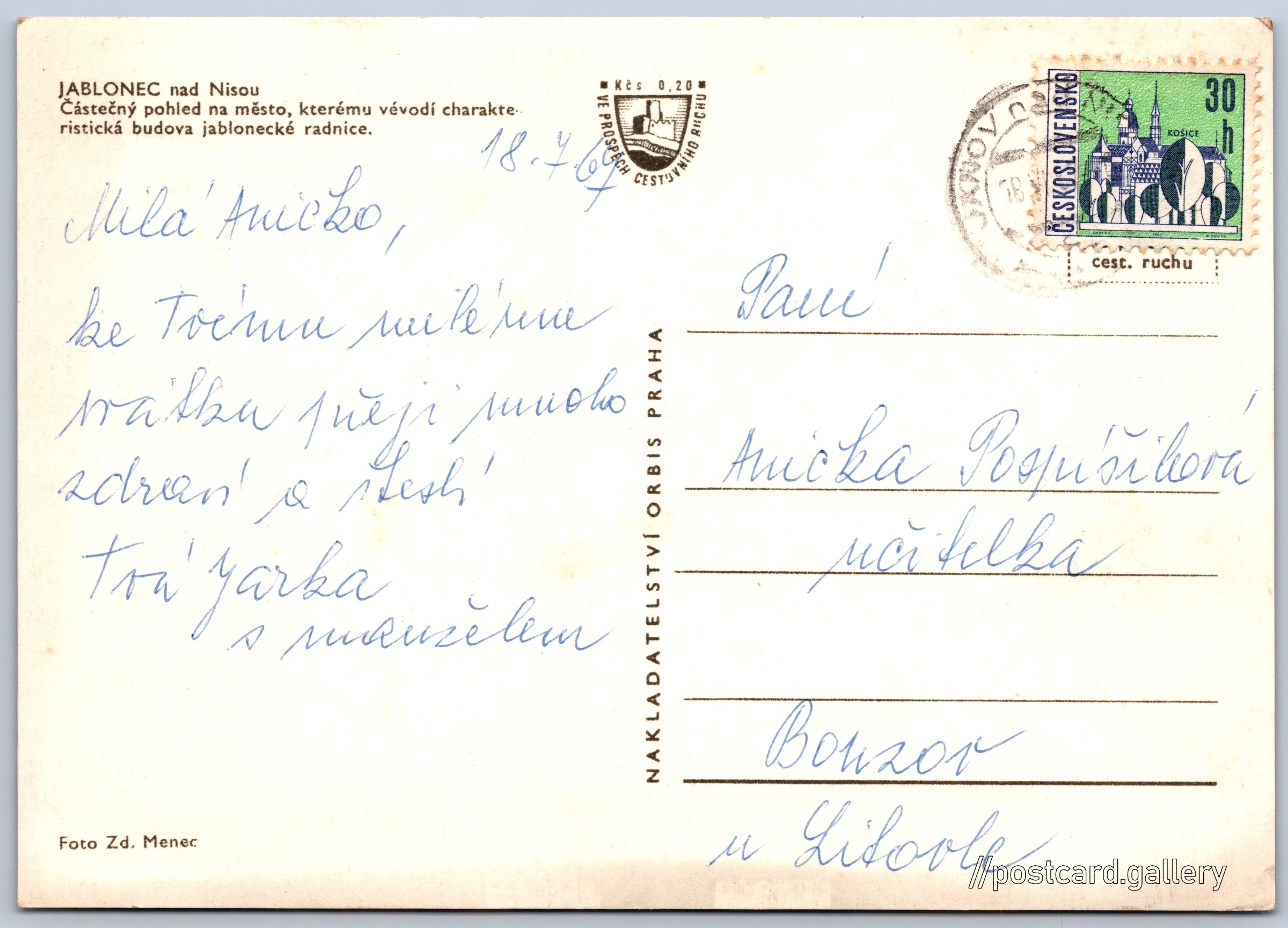 Jablonec nad Nisou, pohled na město Pokud chcete vidět pohlednice ve vyšším rozlišení nebo zobrazovat jejich zadní stranu, tak se prosím nejdříve přihlašte Přihlásit Zaregistrovat JABLONEC nad NisouČástečný pohled na město, kterému vévodí charakteristická budova jablonecké radnice. Jazyk tištěného textu na pohlednici: čeština Magistrát města Jablonec nad Nisou, Mírové náměstí 3100/19, Jablonec nad Nisou, Česko ukázat na mapě Vydavatel: Nakladatelství Orbis (Československo) Odhadované datum vydání pohlednice: 1964 - 1967 Pomozte nám zpřesnit rok vzniku pohlednice Velikost (š x v) a tvar pohlednice: 147 x 104 mm (5.79" x 4.09"), obdélník Osoby spjaté s touto pohlednicí: Zdeněk Menec(Autor fotografie) Prošlá poštou:Datum na razítku: 18.7.1967Datum napsání pohledu: 18.7.1967 Ceny: Příplatek na tur. ruch: 0,20 Kčs (CSK))Vyplacené známky: 0,30 Kčs (CSK) DiskuseVložit příspěvek Přidat novou složku ... Spravovat složky ...