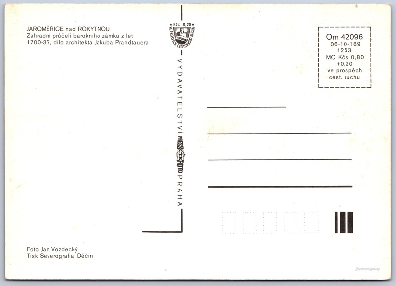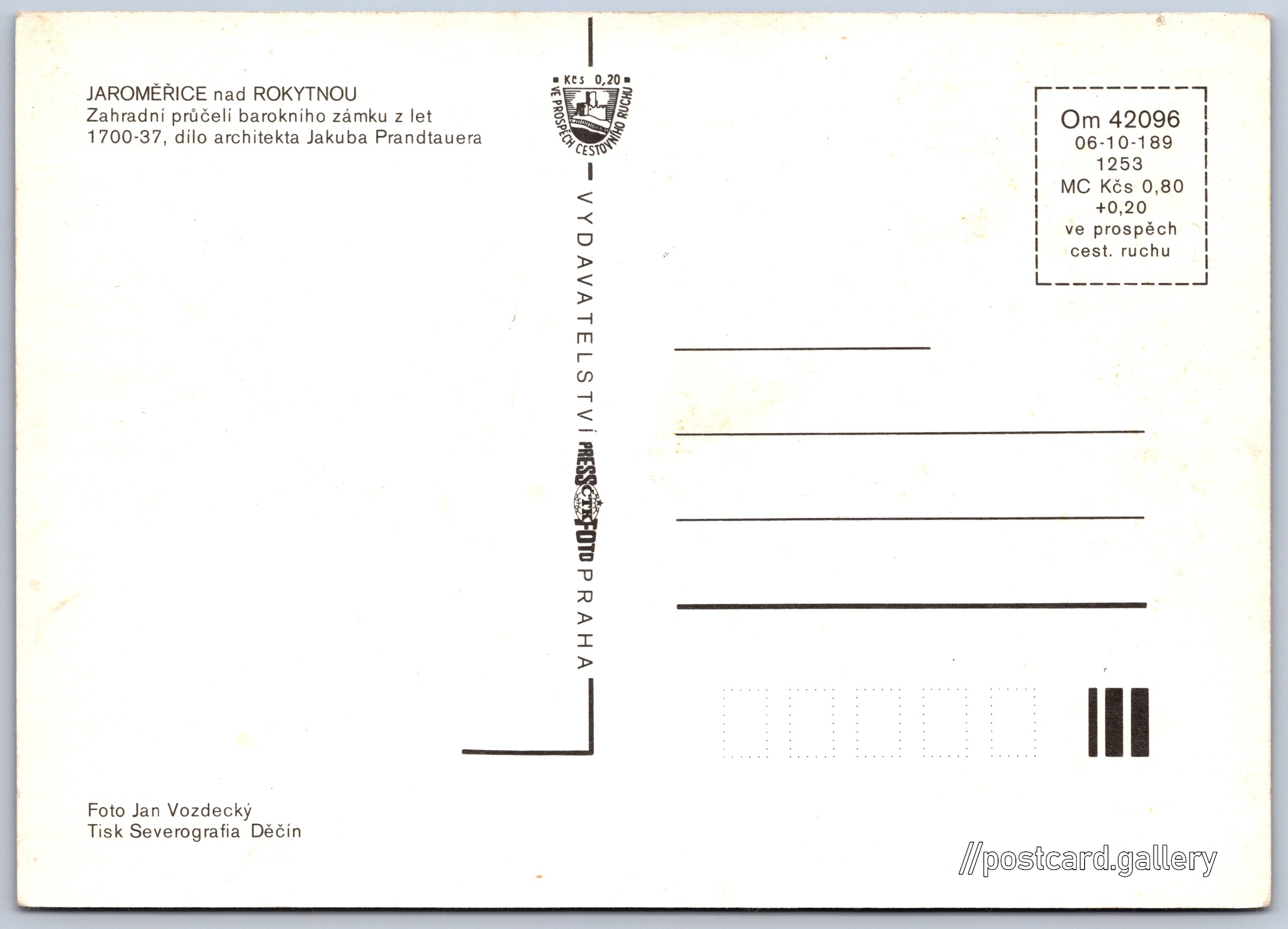 Jaroměřice nad Rokytnou, zámek Pokud chcete vidět pohlednice ve vyšším rozlišení nebo zobrazovat jejich zadní stranu, tak se prosím nejdříve přihlašte Přihlásit Zaregistrovat JAROMĚŘICE nad ROKYTNOUZahradní průčelí barokního zámku z let 1700 - 37, dílo architekta Jakuba Prandtauera Jazyk tištěného textu na pohlednici: čeština Zámek Jaroměřice nad Rokytnou, Zámek, nám. Míru 1, Jaroměřice nad Rokytnou, Česko ukázat na mapě V blízkém okolí místa zobrazeného na pohlednici lze najít 3 jiné pohlednice. Zobrazit blízké pohlednice Vydavatel: PressFoto Praha (Československo) Rok vydání pohlednice: 1981 Velikost (š x v) a tvar pohlednice: 147 x 105 mm (5.79" x 4.13"), obdélník Osoby spjaté s touto pohlednicí: Jan Vozdecký(Autor fotografie) Jakub Prandtauer(Obsah pohlednice) Čistá pohlednice (neprošlá poštou) Ceny: Cena pohlednice: 0,80 Kčs (CSK) (+0,20 Kčs přípl. na tur. ruch) Kódy na pohlednici: Om 42096 06-10-189 1253 DiskuseVložit příspěvek Přidat novou složku ... Spravovat složky ...