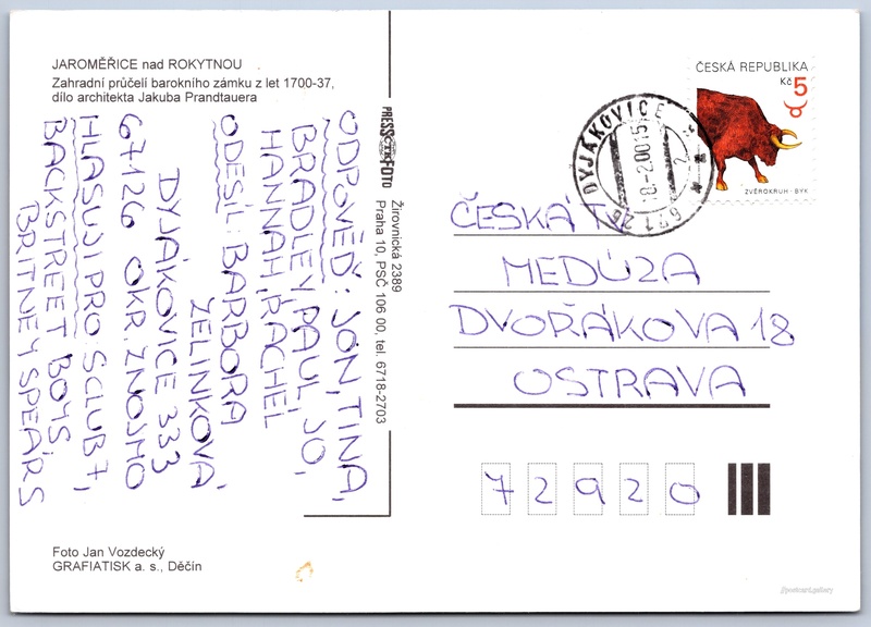 Jaroměřice nad Rokytnou Pokud chcete vidět pohlednice ve vyšším rozlišení nebo zobrazovat jejich zadní stranu, tak se prosím nejdříve přihlašte Přihlásit Zaregistrovat JAROMĚŘICE nad ROKYTNOUZahradní průčelí barokního zámku z let 1700-37, dílo architekta Jakuba Prandtauera Jazyk tištěného textu na pohlednici: čeština Zámek Jaroměřice nad Rokytnou, Zámek, nám. Míru 1, Jaroměřice nad Rokytnou, Česko ukázat na mapě V blízkém okolí místa zobrazeného na pohlednici lze najít 3 jiné pohlednice. Zobrazit blízké pohlednice Vydavatel: PressFoto Praha (Československo) Odhadované datum vydání pohlednice: 1997 - 2000 Pomozte nám zpřesnit rok vzniku pohlednice Velikost (š x v) a tvar pohlednice: 148 x 104 mm (5.83" x 4.09"), obdélník Osoby spjaté s touto pohlednicí: Jan Vozdecký(Autor fotografie) Jakub Prandtauer(Obsah pohlednice) Prošlá poštou:Datum na razítku: 8.2.2000 Ceny: Vyplacené známky: 5,00 Kč (CZK) DiskuseVložit příspěvek Přidat novou složku ... Spravovat složky ...