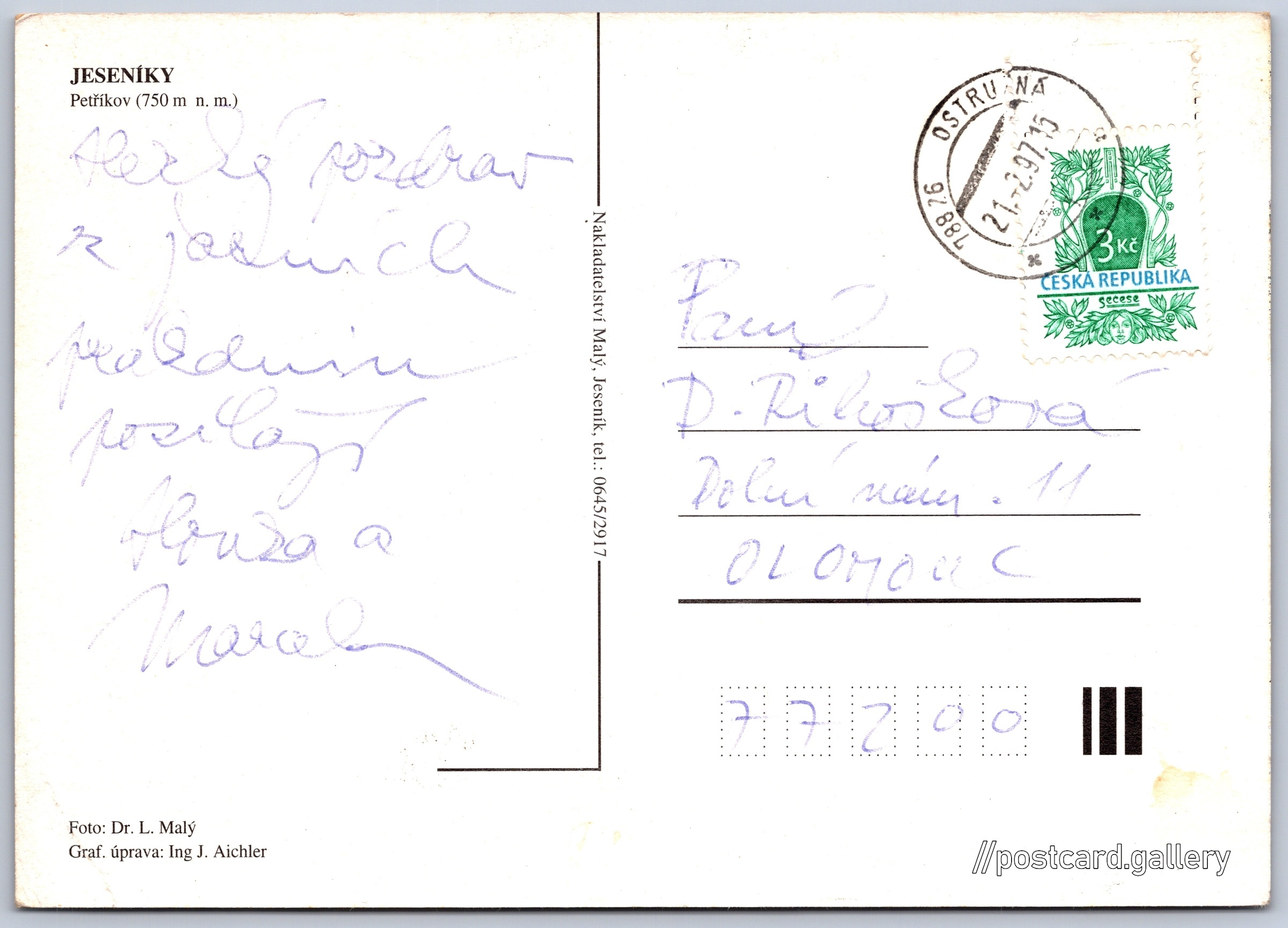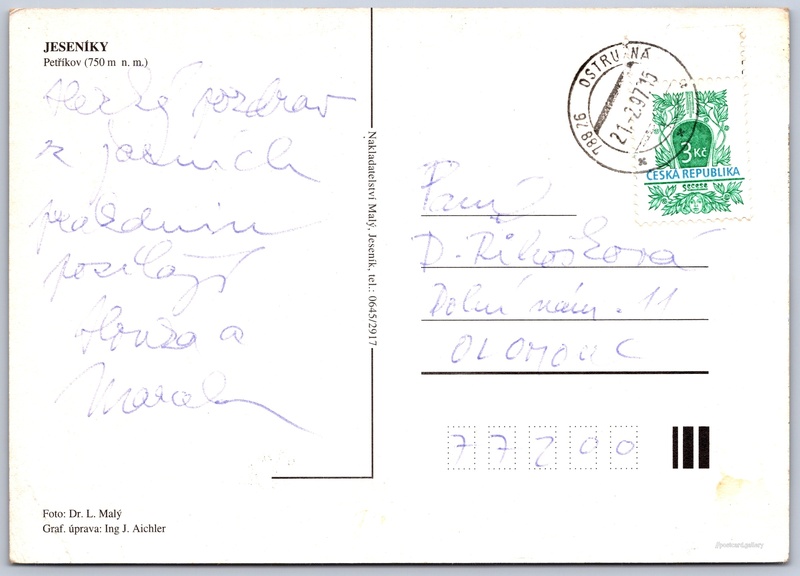 Jedeníky, Petříkov Pokud chcete vidět pohlednice ve vyšším rozlišení nebo zobrazovat jejich zadní stranu, tak se prosím nejdříve přihlašte Přihlásit Zaregistrovat Petříkov JESENÍKYPetříkov (750 m n. m.) Jazyk tištěného textu na pohlednici: čeština Petříkov, Ostružná, Jeseník ukázat na mapě V blízkém okolí místa zobrazeného na pohlednici lze najít 4 jiné pohlednice. Zobrazit blízké pohlednice Vydavatel: Nakladatelství Malý (Česko) Odhadované datum vydání pohlednice: 1994 - 1997 Pomozte nám zpřesnit rok vzniku pohlednice Velikost (š x v) a tvar pohlednice: 147 x 105 mm (5.79" x 4.13"), obdélník Osoby spjaté s touto pohlednicí: Ing. J. Aichler(Design pohlednice) RNDr. L. Malý(Autor fotografie) Prošlá poštou:Datum na razítku: 21.2.1997 Ceny: Vyplacené známky: 3,00 Kč (CZK) DiskuseVložit příspěvek Přidat novou složku ... Spravovat složky ...
