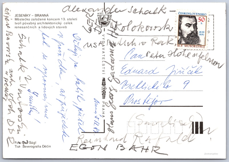 Jeseníky, Branná 1/2 Pokud chcete vidět pohlednice ve vyšším rozlišení nebo zobrazovat jejich zadní stranu, tak se prosím nejdříve přihlašte Přihlásit Zaregistrovat JESENÍKY - BRANNÁMěstečko založené koncem 13. století tvoří půvabný architektonický celek renesančních a lidových staveb Jazyk tištěného textu na pohlednici: čeština Branná, Obec, Česko ukázat na mapě V blízkém okolí místa zobrazeného na pohlednici lze najít 4 jiné pohlednice. Zobrazit blízké pohlednice Vydavatel: PressFoto Praha (Československo) Datum vydání není známo Pomozte nám odhadnout datum vzniku pohlednice Velikost (š x v) a tvar pohlednice: 148 x 103 mm (5.83" x 4.06"), obdélník Osoby spjaté s touto pohlednicí: Jan Ságl(Autor fotografie) Prošlá poštou:Datum napsání pohledu: 5.12.1989 Ceny: Příplatek na tur. ruch: 0,20 Kčs (CSK))Vyplacené známky: 0,50 Kčs (CSK) DiskuseVložit příspěvek Přidat novou složku ... Spravovat složky ...