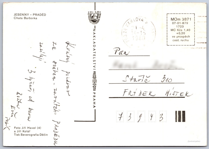 Jeseníky, chata Barborka Pokud chcete vidět pohlednice ve vyšším rozlišení nebo zobrazovat jejich zadní stranu, tak se prosím nejdříve přihlašte Přihlásit Zaregistrovat JeseníkyChata Barborka JESENÍKY - PRADĚDChata Barborka Jazyk tištěného textu na pohlednici: čeština Praděd (1491 m), Hora, výškový bod, Malá Morávka, Česko ukázat na mapě Vydavatel: PressFoto Praha (Československo) Rok vydání pohlednice: 1978 Velikost (š x v) a tvar pohlednice: 148 x 105 mm (5.83" x 4.13"), obdélník Osoby spjaté s touto pohlednicí: Ing. Jiří Havel(Autor fotografie) Jiří Kolář(Autor fotografie) Prošlá poštou:Datum na razítku: 21.4.1980 Ceny: Cena pohlednice: 1,40 Kčs (CSK) (+0,20 Kčs přípl. na tur. ruch) Kódy na pohlednici: MOm 3871 07-01-879 1723 DiskuseVložit příspěvek Přidat novou složku ... Spravovat složky ...