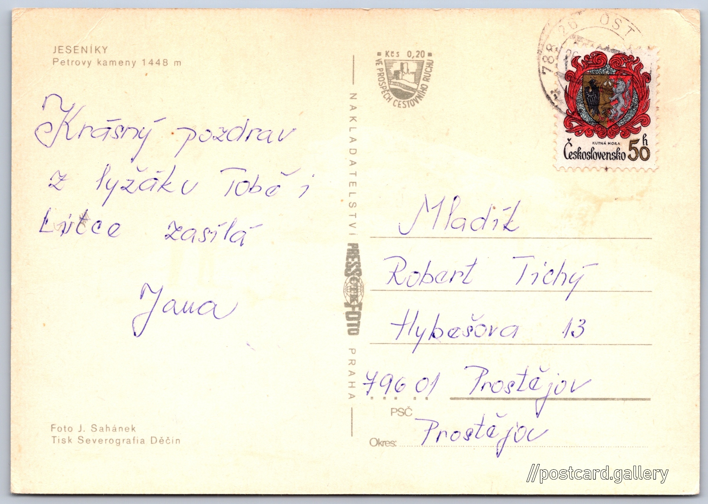 Jeseníky, Petrovy kameny Pokud chcete vidět pohlednice ve vyšším rozlišení nebo zobrazovat jejich zadní stranu, tak se prosím nejdříve přihlašte Přihlásit Zaregistrovat JESENÍKYPetrovy kameny 1448 m Jazyk tištěného textu na pohlednici: čeština Petrovy kameny, Skalní útvar, Malá Morávka, Česko ukázat na mapě V blízkém okolí místa zobrazeného na pohlednici lze najít 26 jiných pohlednic. Zobrazit blízké pohlednice Vydavatel: PressFoto Praha (Československo) Datum vydání není známo Pomozte nám odhadnout datum vzniku pohlednice Velikost (š x v) a tvar pohlednice: 147 x 104 mm (5.79" x 4.09"), obdélník Osoby spjaté s touto pohlednicí: Jaromír Sahánek(Autor fotografie) Prošlá poštou Ceny: Příplatek na tur. ruch: 0,20 Kčs (CSK))Vyplacené známky: 0,50 Kčs (CSK) DiskuseVložit příspěvek Přidat novou složku ... Spravovat složky ...
