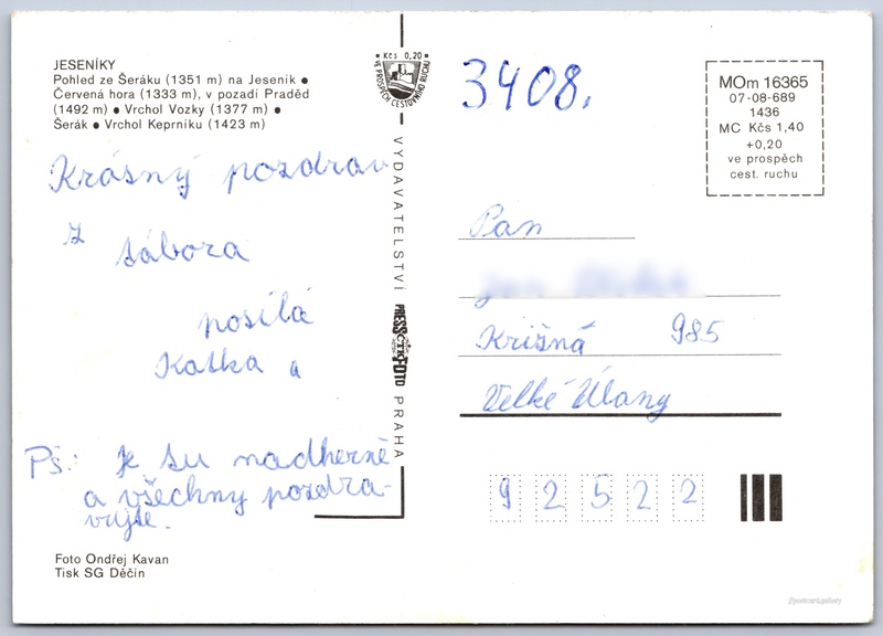 Jeseníky Pokud chcete vidět pohlednice ve vyšším rozlišení nebo zobrazovat jejich zadní stranu, tak se prosím nejdříve přihlašte Přihlásit Zaregistrovat Chráněná krajinná oblastJeseníky JESENÍKY- Pohled ze Šeráku (1351 m) na Jeseník- Červená hora (1333 m), v pozadí Praděd (1492 m)- Vrchol Vozky (1377 m)- Šerák- Vrchol Keprníku (1423 m) Jazyk tištěného textu na pohlednici: čeština Keprník (1423 m), Hora, výškový bod, Ostružná, Česko ukázat na mapě Vydavatel: PressFoto Praha (Československo) Rok vydání pohlednice: 1986 Velikost (š x v) a tvar pohlednice: 148 x 105 mm (5.83" x 4.13"), obdélník Osoby spjaté s touto pohlednicí: Ondřej Kavan(Autor fotografie) Prošlá poštou Ceny: Cena pohlednice: 1,40 Kčs (CSK) (+0,20 Kčs přípl. na tur. ruch) Kódy na pohlednici: MOm 16365 07-08-689 1436 DiskuseVložit příspěvek Přidat novou složku ... Spravovat složky ...