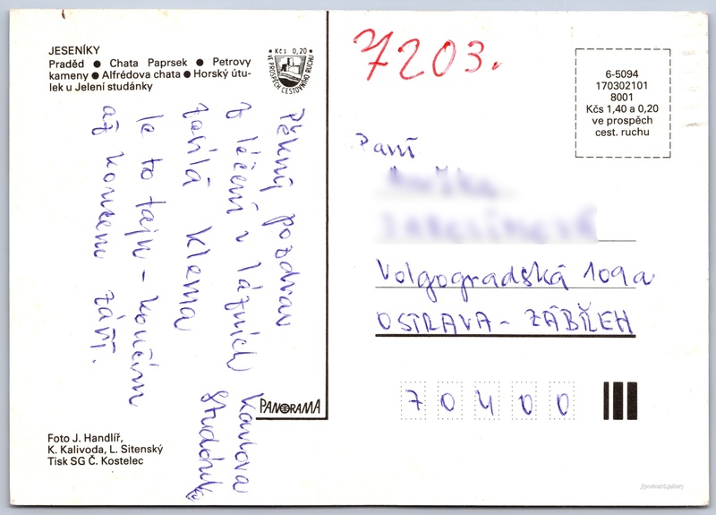 Jeseníky Pokud chcete vidět pohlednice ve vyšším rozlišení nebo zobrazovat jejich zadní stranu, tak se prosím nejdříve přihlašte Přihlásit Zaregistrovat Jeseníky JESENÍKY- Praděd- Chata Paprsek- Petrovy kameny- Alfrédova chata- Horský útulek u Jelení studánky Jazyk tištěného textu na pohlednici: čeština Malá Morávka, Bruntál ukázat na mapě Vydavatel: Panorama (Československo) Datum vydání není známo Pomozte nám odhadnout datum vzniku pohlednice Velikost (š x v) a tvar pohlednice: 148 x 105 mm (5.83" x 4.13"), obdélník Osoby spjaté s touto pohlednicí: Ladislav Sitenský(Autor fotografie) Jiří Handlíř(Autor fotografie) K. Kalivoda(Autor fotografie) Prošlá poštou Ceny: Cena pohlednice: 1,40 Kčs (CSK) (+0,20 Kčs přípl. na tur. ruch) Kódy na pohlednici: 6-5094 170302101 8001 DiskuseVložit příspěvek Přidat novou složku ... Spravovat složky ...