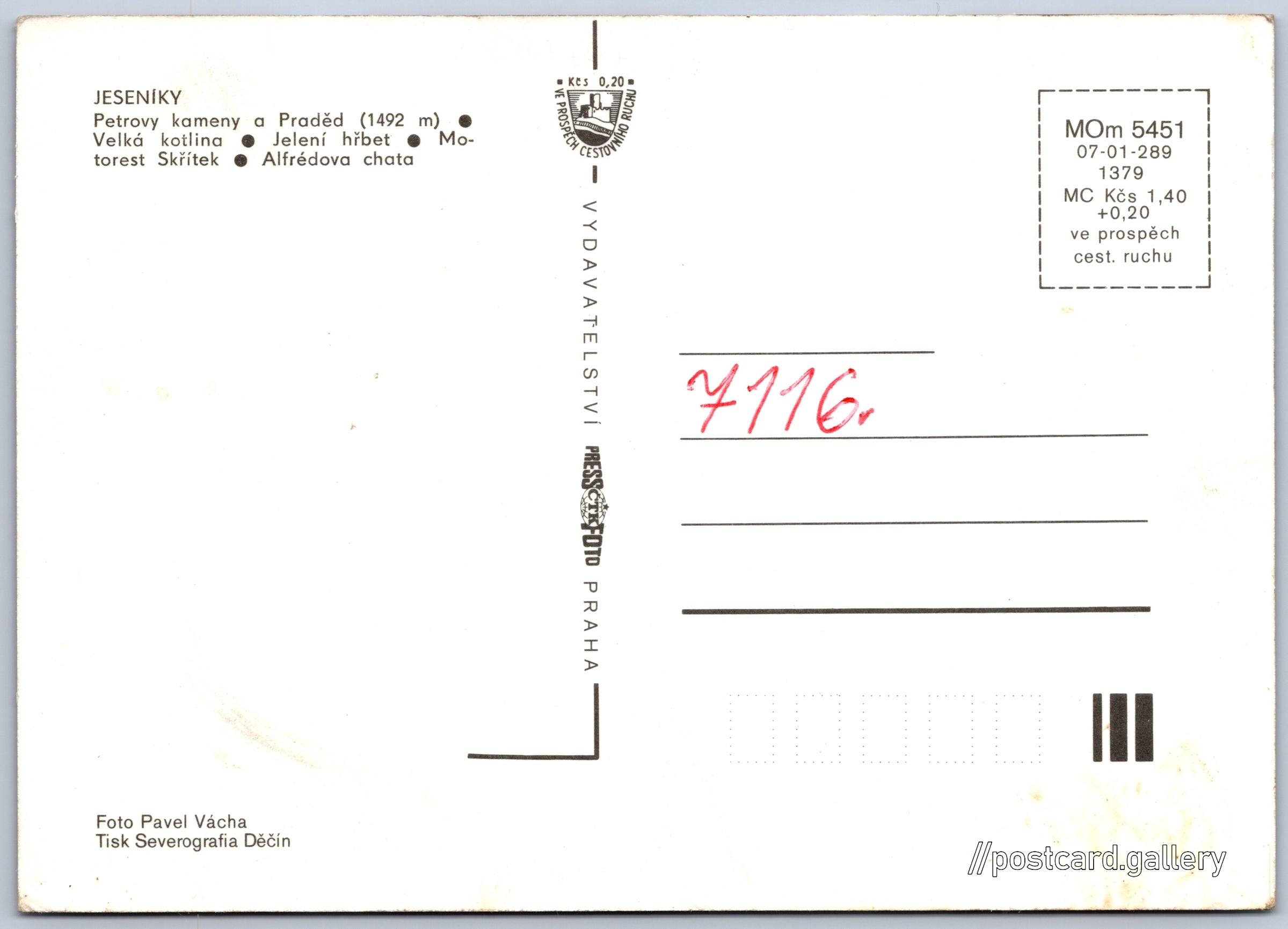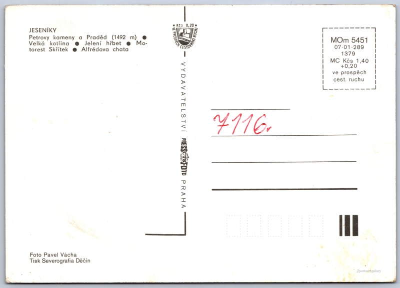 Jeseníky Pokud chcete vidět pohlednice ve vyšším rozlišení nebo zobrazovat jejich zadní stranu, tak se prosím nejdříve přihlašte Přihlásit Zaregistrovat Jeseníky JESENÍKY- Petrovy kameny a Praděd (1492 m)- Velká kotlina- Jelení hřbet- Motorest Skřítek- Alfrédova chata Jazyk tištěného textu na pohlednici: čeština Malá Morávka, Bruntál ukázat na mapě Vydavatel: PressFoto Praha (Československo) Rok vydání pohlednice: 1982 Velikost (š x v) a tvar pohlednice: 148 x 105 mm (5.83" x 4.13"), obdélník Osoby spjaté s touto pohlednicí: Pavel Vácha(Autor fotografie) Čistá pohlednice (neprošlá poštou) Ceny: Cena pohlednice: 1,40 Kčs (CSK) (+0,20 Kčs přípl. na tur. ruch) Kódy na pohlednici: MOm 5451 07-01-289 1379 DiskuseVložit příspěvek Přidat novou složku ... Spravovat složky ...