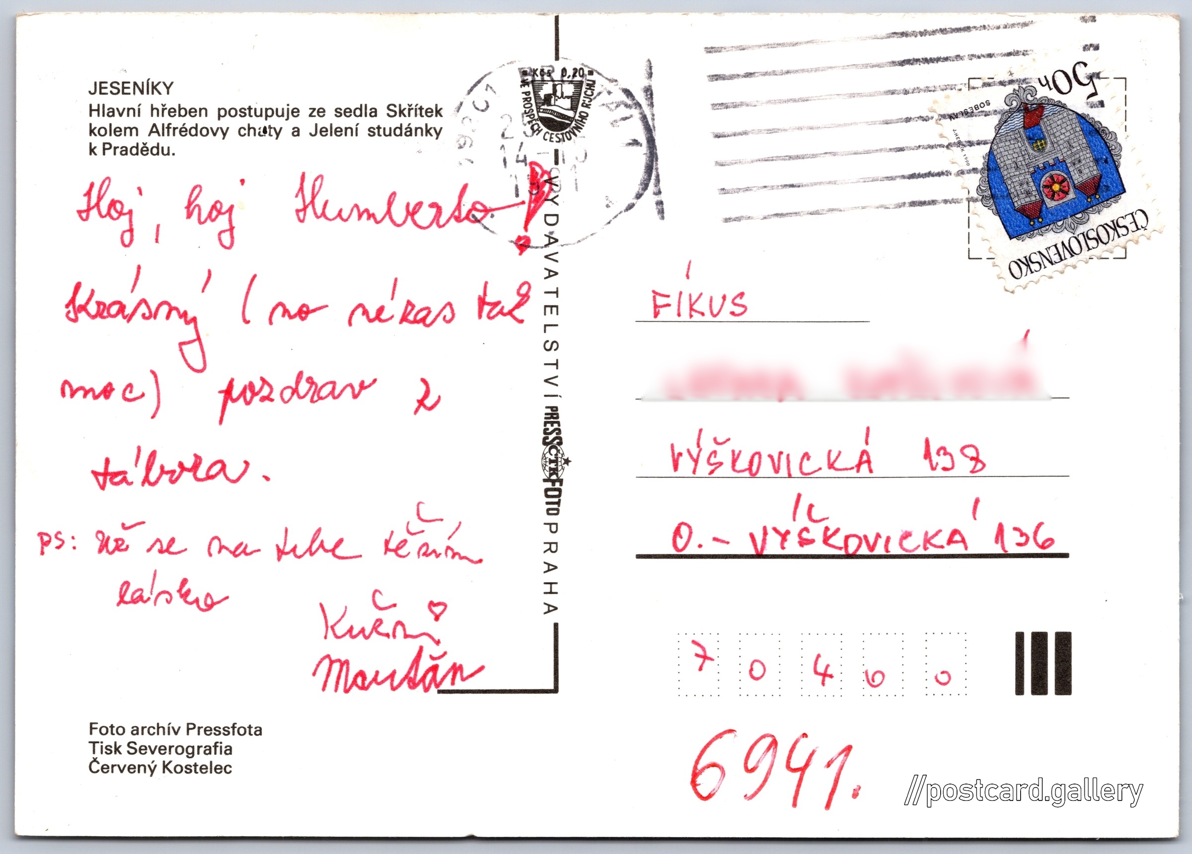 Jeseníky Pokud chcete vidět pohlednice ve vyšším rozlišení nebo zobrazovat jejich zadní stranu, tak se prosím nejdříve přihlašte Přihlásit Zaregistrovat Jeseníky JESENÍKYHlavní hřeben postupuje ze sedla Skřítek kolem Alfrédovy chaty a Jelení studánky k Pradědu. Jazyk tištěného textu na pohlednici: čeština Malá Morávka, Bruntál ukázat na mapě Vydavatel: PressFoto Praha (Československo) Odhadované datum vydání pohlednice: 1988 - 1991 Pomozte nám zpřesnit rok vzniku pohlednice Velikost (š x v) a tvar pohlednice: 148 x 105 mm (5.83" x 4.13"), obdélník Prošlá poštou:Datum na razítku: 25.7.1991 Ceny: Příplatek na tur. ruch: 0,20 Kčs (CSK))Vyplacené známky: 0,50 Kčs (CSK) DiskuseVložit příspěvek Přidat novou složku ... Spravovat složky ...