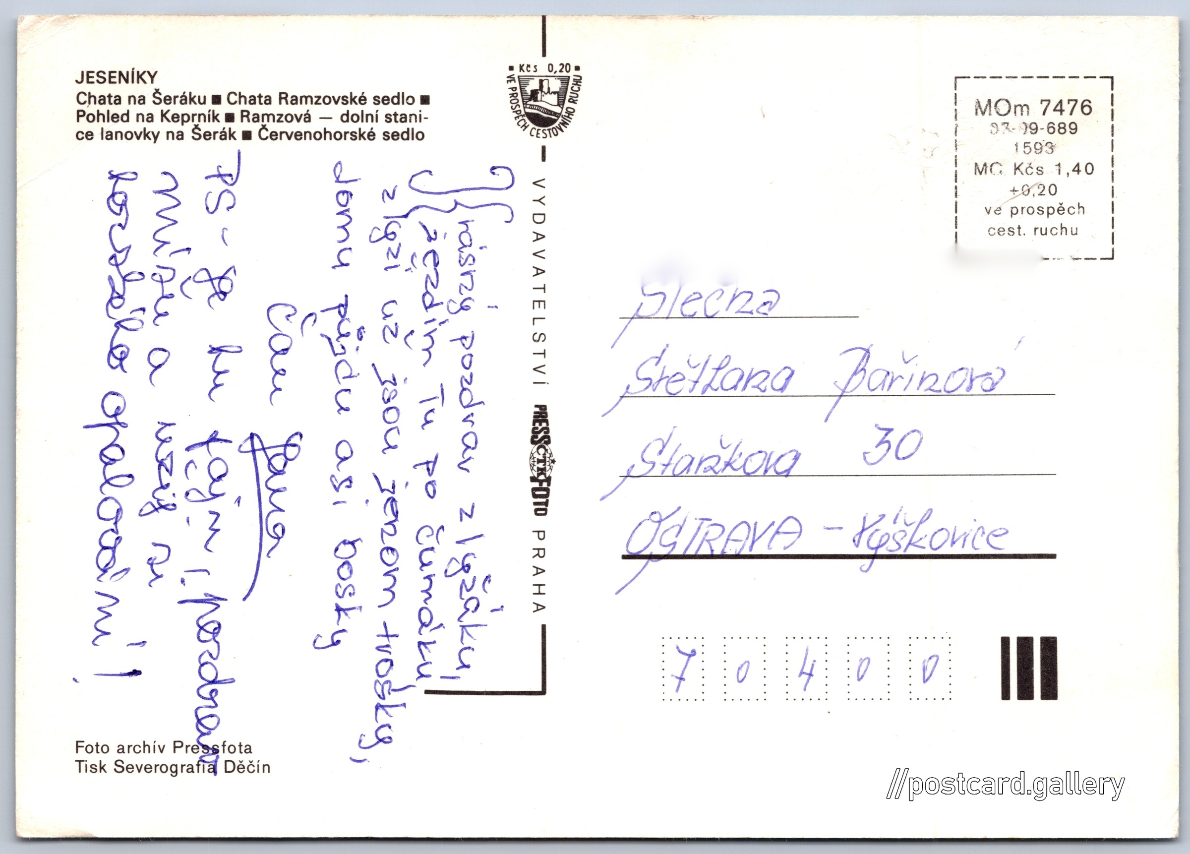 Jeseníky Pokud chcete vidět pohlednice ve vyšším rozlišení nebo zobrazovat jejich zadní stranu, tak se prosím nejdříve přihlašte Přihlásit Zaregistrovat Jeseníky JESENÍKY- Chata na Šeráku- Chata Ramzovské sedlo- Pohled na Keprník- Ramzová - dolní stanice lanovky na Šerák- Červenohorské sedlo Jazyk tištěného textu na pohlednici: čeština Keprník (1423 m), Hora, výškový bod, Ostružná, Česko ukázat na mapě Vydavatel: PressFoto Praha (Československo) Rok vydání pohlednice: 1986 Velikost (š x v) a tvar pohlednice: 147 x 104 mm (5.79" x 4.09"), obdélník Prošlá poštou Ceny: Cena pohlednice: 1,40 Kčs (CSK) (+0,20 Kčs přípl. na tur. ruch) Kódy na pohlednici: MOm 7476 07-09-689 1593 DiskuseVložit příspěvek Přidat novou složku ... Spravovat složky ...