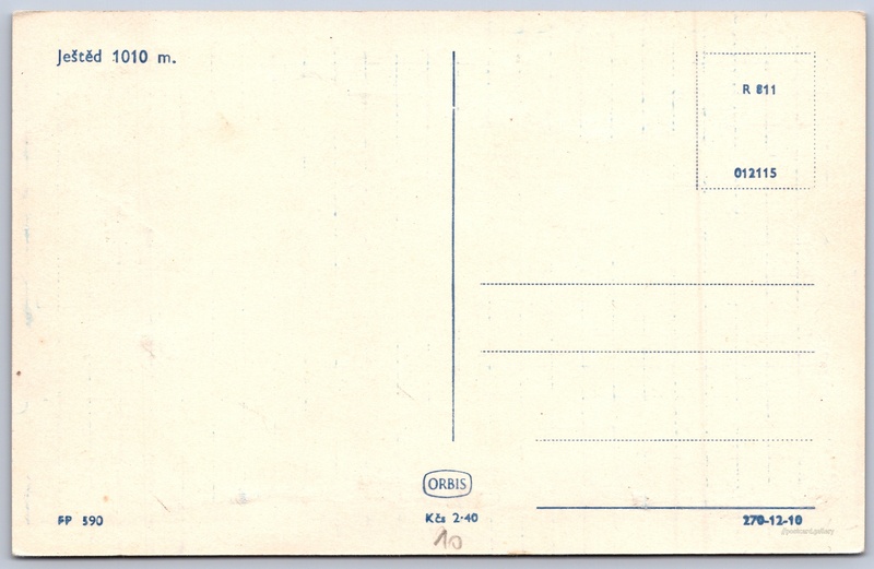 Ještěd, rozhledna Pokud chcete vidět pohlednice ve vyšším rozlišení nebo zobrazovat jejich zadní stranu, tak se prosím nejdříve přihlašte Přihlásit Zaregistrovat Ještěd 1010 m. Jazyk tištěného textu na pohlednici: čeština Rozhledna Ještěd, Rozhledna, Liberec XIX-Horní Hanychov 153, Liberec XIX-Horní Hanychov, Česko ukázat na mapě Vydavatel: Nakladatelství Orbis (Československo) Odhadované datum vydání pohlednice: 1950 - 1953 Pomozte nám zpřesnit rok vzniku pohlednice Velikost (š x v) a tvar pohlednice: 137 x 88 mm (5.39" x 3.46"), obdélník Čistá pohlednice (neprošlá poštou) Ceny: Cena pohlednice: 2,40 Kčs (CSK) Kódy na pohlednici: FP 590 R 811 012115 270-12-10 DiskuseVložit příspěvek Přidat novou složku ... Spravovat složky ...
