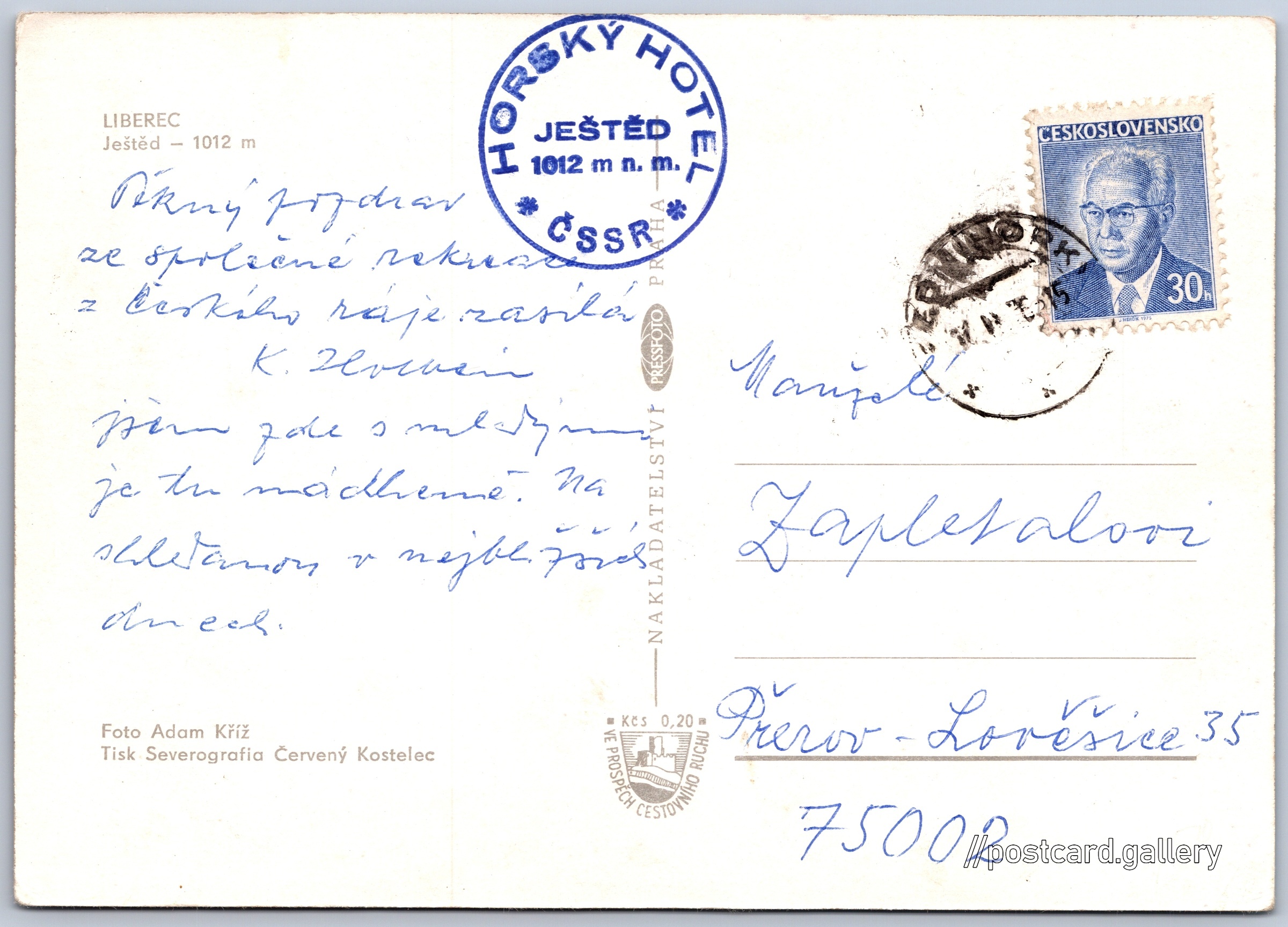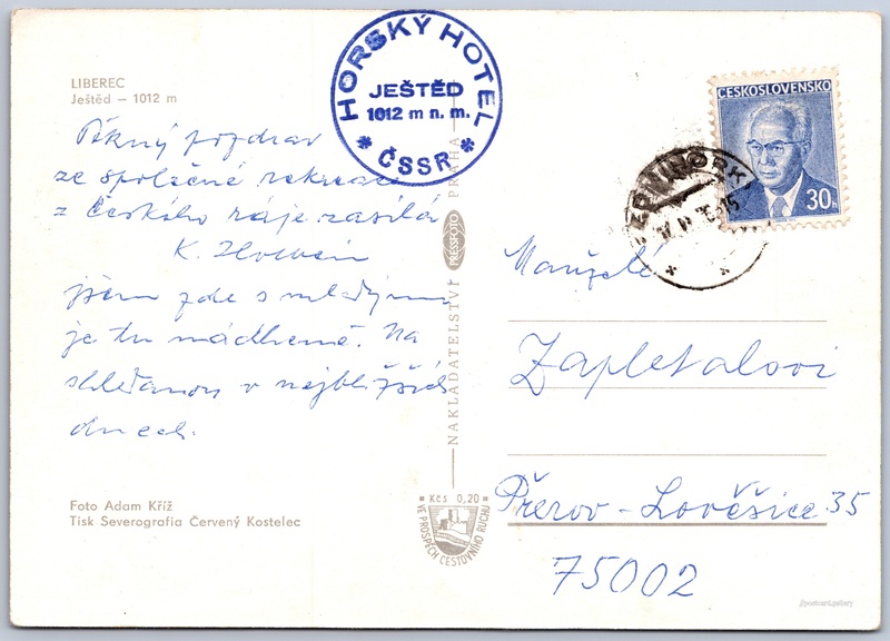 Ještěd Pokud chcete vidět pohlednice ve vyšším rozlišení nebo zobrazovat jejich zadní stranu, tak se prosím nejdříve přihlašte Přihlásit Zaregistrovat LIBERECJeštěd - 1012 mText razítka:Horský hotel Ještěd1012 m n. m.ČSSR Jazyk tištěného textu na pohlednici: čeština Liberec (nečleněné město), Liberec, Liberec ukázat na mapě V blízkém okolí místa zobrazeného na pohlednici lze najít 15 jiných pohlednic. Zobrazit blízké pohlednice Vydavatel: PressFoto Praha (Československo) Odhadované datum vydání pohlednice: 1973 - 1976 Pomozte nám zpřesnit rok vzniku pohlednice Velikost (š x v) a tvar pohlednice: 148 x 105 mm (5.83" x 4.13"), obdélník Osoby spjaté s touto pohlednicí: Adam Kříž(Autor fotografie) Prošlá poštou Ceny: Příplatek na tur. ruch: 0,20 Kčs (CSK))Vyplacené známky: 0,30 Kčs (CSK) DiskuseVložit příspěvek Přidat novou složku ... Spravovat složky ...