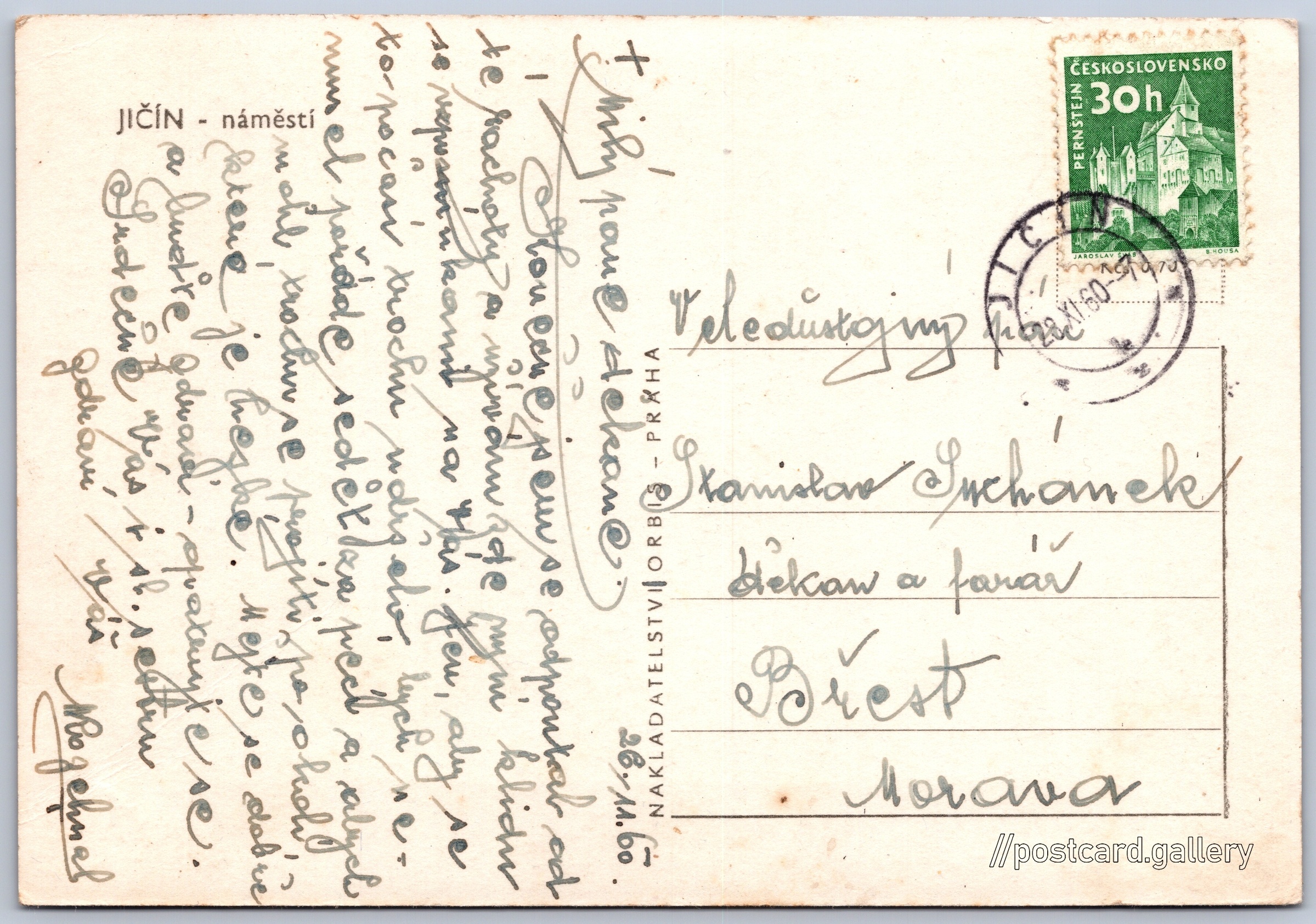 Jičín, náměstí Pokud chcete vidět pohlednice ve vyšším rozlišení nebo zobrazovat jejich zadní stranu, tak se prosím nejdříve přihlašte Přihlásit Zaregistrovat JIČÍN - náměstí Jazyk tištěného textu na pohlednici: čeština Staré Město, Jičín, Jičín ukázat na mapě V blízkém okolí místa zobrazeného na pohlednici lze najít 1 jinou pohlednici. Zobrazit blízké pohlednice Vydavatel: Nakladatelství Orbis (Československo) Odhadované datum vydání pohlednice: 1957 - 1960 Pomozte nám zpřesnit rok vzniku pohlednice Velikost (š x v) a tvar pohlednice: 147 x 101 mm (5.79" x 3.98"), obdélník Prošlá poštou:Datum na razítku: 28.11.1960Datum napsání pohledu: 23.11.1960 Ceny: Vyplacené známky: 0,30 Kčs (CSK) DiskuseVložit příspěvek Přidat novou složku ... Spravovat složky ...