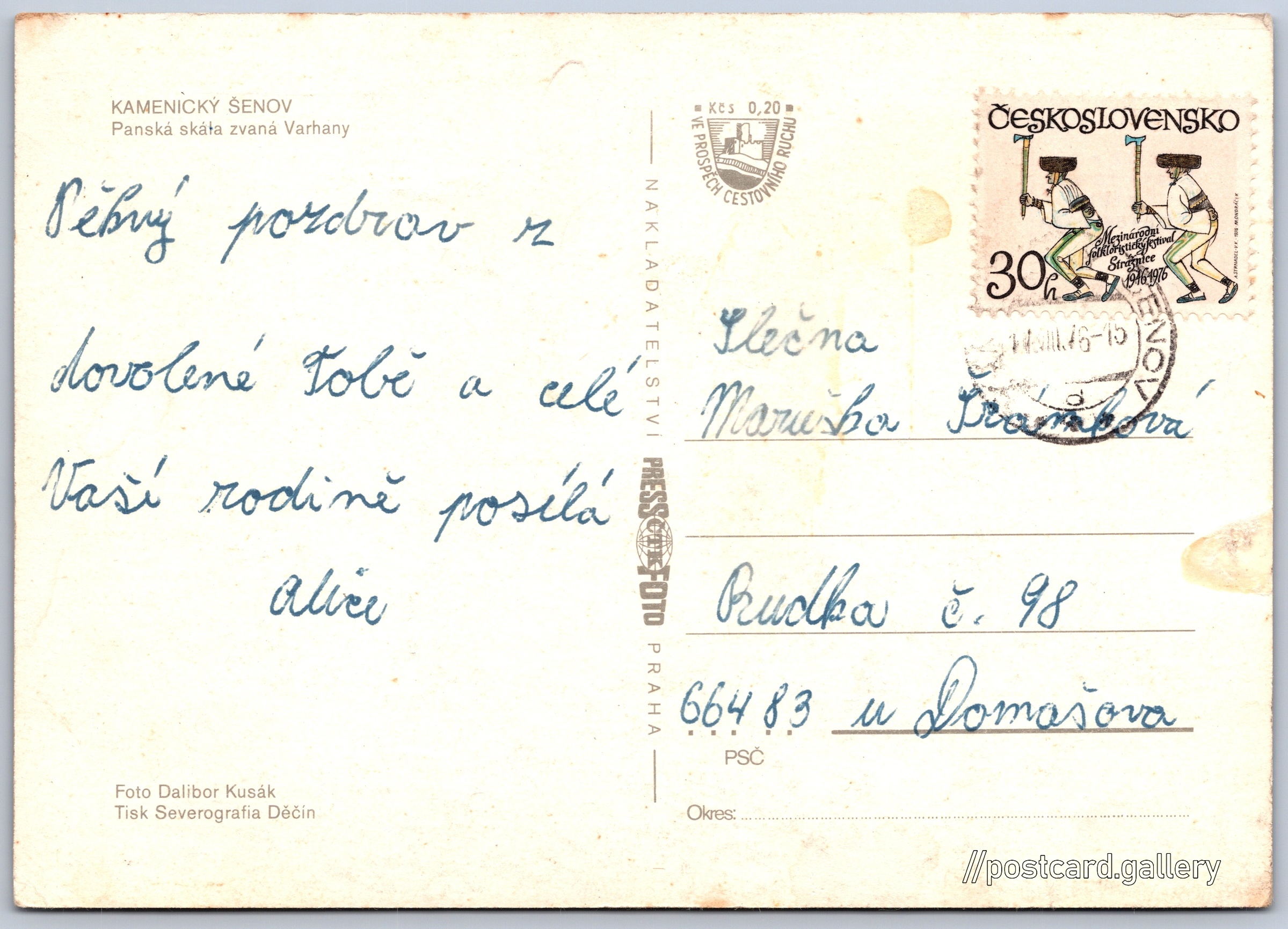 Kamenický Šenov, Panská skála Pokud chcete vidět pohlednice ve vyšším rozlišení nebo zobrazovat jejich zadní stranu, tak se prosím nejdříve přihlašte Přihlásit Zaregistrovat KAMENICKÝ ŠENOVPanská skáła zvaná Varhany Jazyk tištěného textu na pohlednici: čeština Kamenický Šenov, Česká Lípa ukázat na mapě V blízkém okolí místa zobrazeného na pohlednici lze najít 2 jiné pohlednice. Zobrazit blízké pohlednice Vydavatel: PressFoto Praha (Československo) Odhadované datum vydání pohlednice: 1973 - 1976 Pomozte nám zpřesnit rok vzniku pohlednice Velikost (š x v) a tvar pohlednice: 148 x 105 mm (5.83" x 4.13"), obdélník Osoby spjaté s touto pohlednicí: Dalibor Kusák(Autor fotografie) Prošlá poštou:Datum na razítku: 17.8.1976 Ceny: Příplatek na tur. ruch: 0,20 Kčs (CSK))Vyplacené známky: 0,30 Kčs (CSK) DiskuseVložit příspěvek Přidat novou složku ... Spravovat složky ...