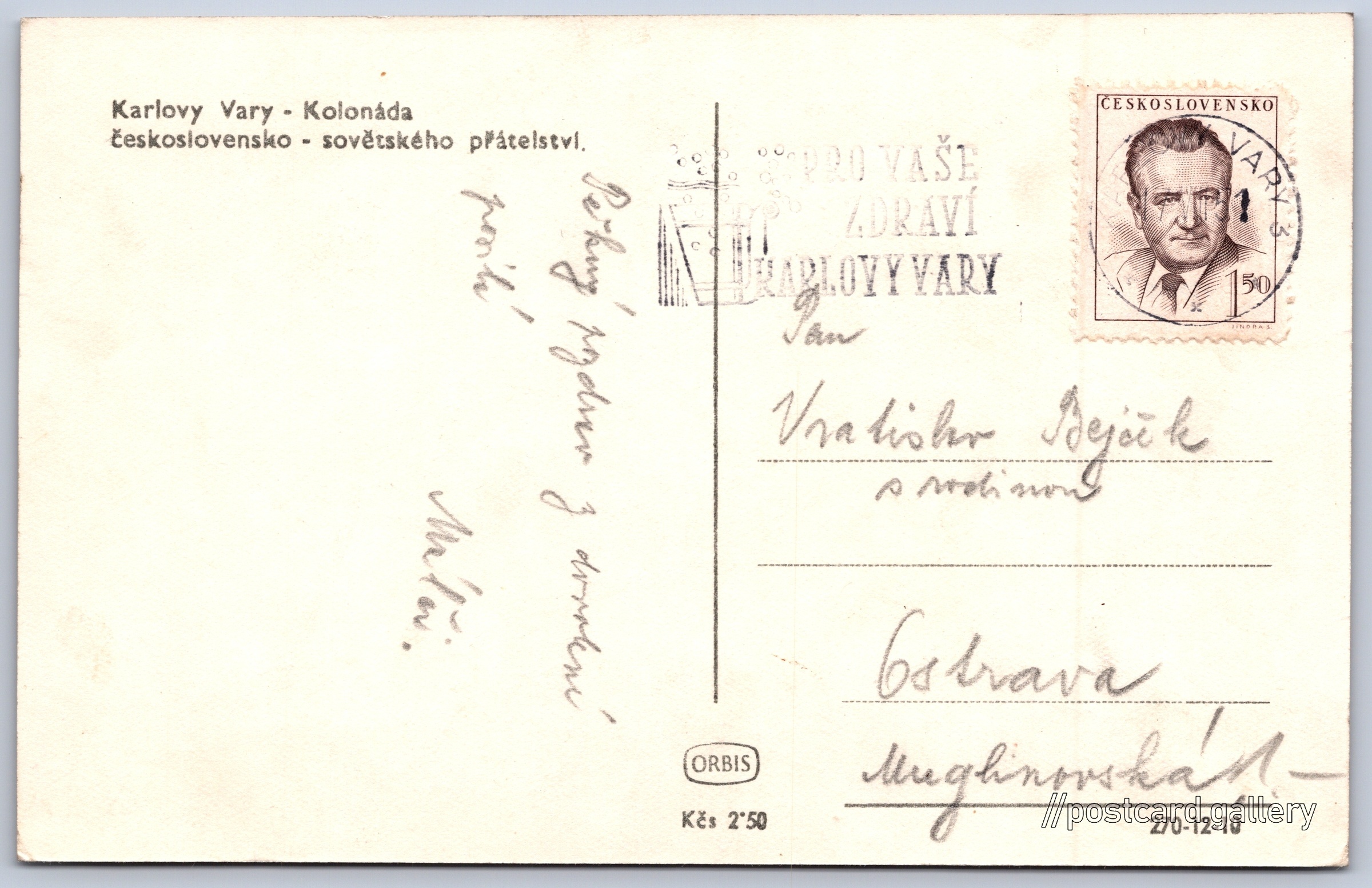 Karlovy Vary, Kolonáda českoíslovensko - sovětského přátelství Pokud chcete vidět pohlednice ve vyšším rozlišení nebo zobrazovat jejich zadní stranu, tak se prosím nejdříve přihlašte Přihlásit Zaregistrovat Karlovy Vary - Kolonáda československo - sovětského přátelství. Jazyk tištěného textu na pohlednici: čeština Lázeňská, Karlovy Vary, Karlovy Vary ukázat na mapě Vydavatel: Nakladatelství Orbis (Československo) Odhadované datum vydání pohlednice: 1948 - 1951 Pomozte nám zpřesnit rok vzniku pohlednice Velikost (š x v) a tvar pohlednice: 139 x 89 mm (5.47" x 3.50"), obdélník Prošlá poštou:Datum na razítku: 17.8.1951 Ceny: Cena pohlednice: 2,50 Kčs (CSK)Vyplacené známky: 1,50 Kčs (CSK) Kódy na pohlednici: 270-12-10 DiskuseVložit příspěvek Přidat novou složku ... Spravovat složky ...