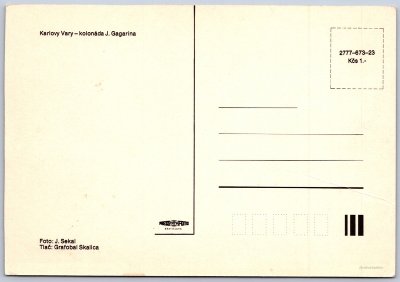 Karlovy Vary, kolonáda J. Gagarina Pokud chcete vidět pohlednice ve vyšším rozlišení nebo zobrazovat jejich zadní stranu, tak se prosím nejdříve přihlašte Přihlásit Zaregistrovat Karlovy Vary - kolonáda J. Gagarina Jazyk tištěného textu na pohlednici: čeština Divadelní náměstí 2036/2, Karlovy Vary, 360 01, Karlovy Vary ukázat na mapě Vydavatel: PressFoto Bratislava (Československo) Datum vydání není známo Pomozte nám odhadnout datum vzniku pohlednice Velikost (š x v) a tvar pohlednice: 149 x 103 mm (5.87" x 4.06"), obdélník Osoby spjaté s touto pohlednicí: Josef Sekal(Autor fotografie) Čistá pohlednice (neprošlá poštou) Ceny: Cena pohlednice: 1,00 Kčs (CSK) Kódy na pohlednici: 2777-673-23 DiskuseVložit příspěvek Přidat novou složku ... Spravovat složky ...