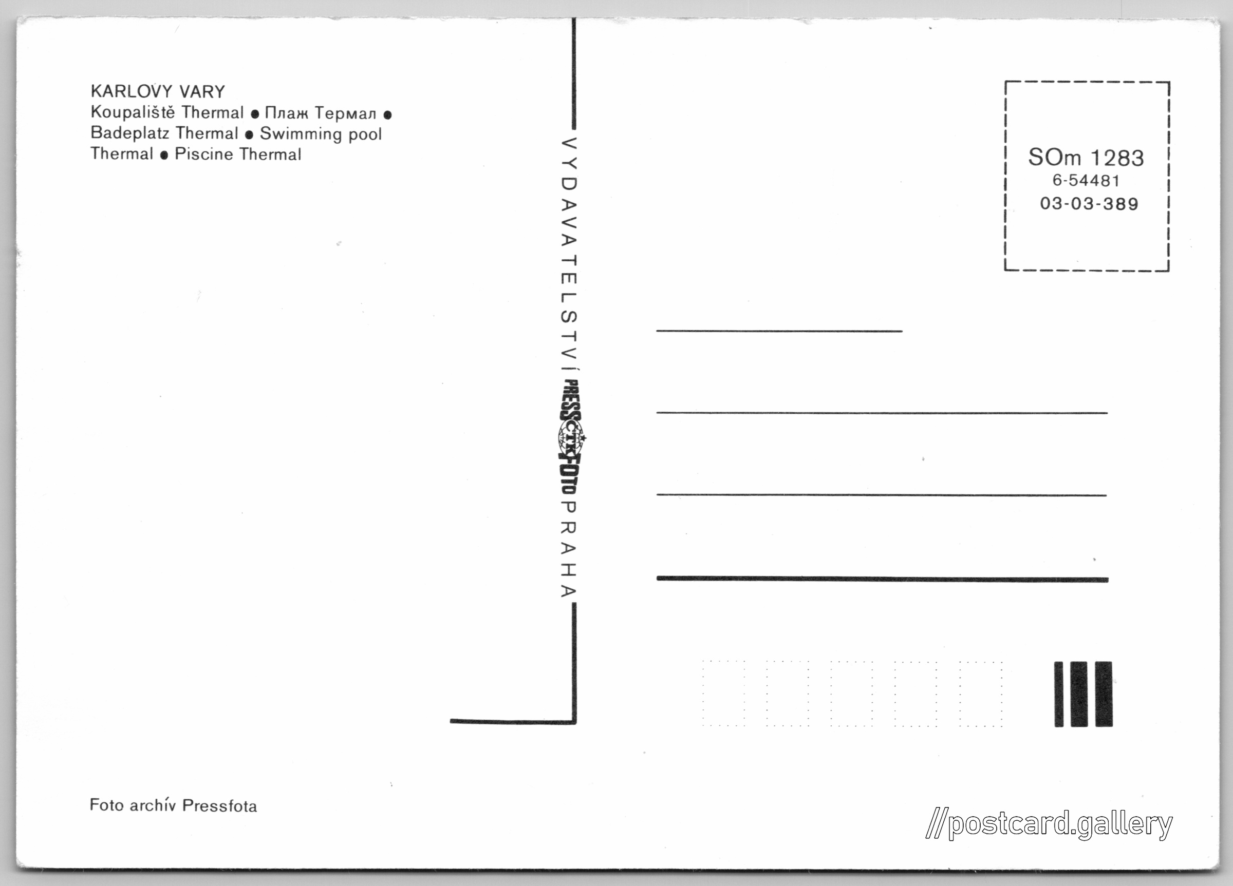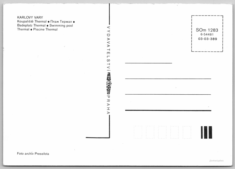 Karlovy Vary, koupaliště Thermal Pokud chcete vidět pohlednice ve vyšším rozlišení nebo zobrazovat jejich zadní stranu, tak se prosím nejdříve přihlašte Přihlásit Zaregistrovat KARLOVY VARY- Koupaliště Thermal- Плаж Термал- Badeplatz Thermal- Swimming pool Thermal- Piscine Thermal Jazyky tištěného textu na pohlednici: čeština, ruština, němčina, angličtina, francouzština Thermal Bazén, I. P. Pavlova 2001/11, Karlovy Vary, Česko ukázat na mapě Vydavatel: PressFoto Praha (Československo) Rok vydání pohlednice: 1983 Velikost (š x v) a tvar pohlednice: 147 x 103 mm (5.79" x 4.06"), obdélník Čistá pohlednice (neprošlá poštou) Kódy na pohlednici: SOm 1283 6-54481 03-03-389 DiskuseVložit příspěvek Přidat novou složku ... Spravovat složky ...