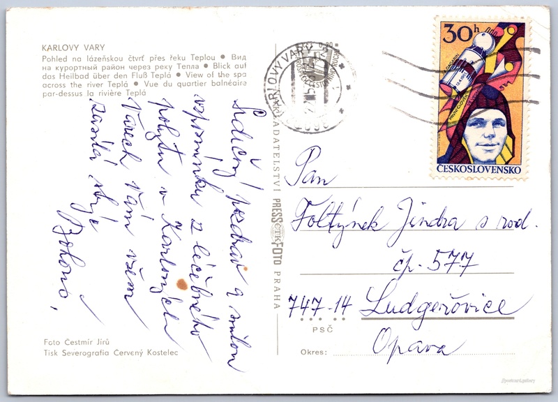 Karlovy Vary, pohled na lázeňskou čtvrť Pokud chcete vidět pohlednice ve vyšším rozlišení nebo zobrazovat jejich zadní stranu, tak se prosím nejdříve přihlašte Přihlásit Zaregistrovat KARLOVY VARY- Pohled na lázeňskou čtvrť přes řeku Teplou- Вид на курортный район через реку Тепла- Blick auf das Heilbad über den Fluß Teplá- View of the spa across the river Teplá- Vue du quartier balnéaire par-dessus la rivière Teplá Jazyk tištěného textu na pohlednici: čeština Stará Louka 330/58, Karlovy Vary, 360 01, Karlovy Vary ukázat na mapě V blízkém okolí místa zobrazeného na pohlednici lze najít 62 jiných pohlednic. Zobrazit blízké pohlednice Vydavatel: PressFoto Praha (Československo) Odhadované datum vydání pohlednice: 1978 - 1981 Pomozte nám zpřesnit rok vzniku pohlednice Velikost (š x v) a tvar pohlednice: 148 x 105 mm (5.83" x 4.13"), obdélník Osoby spjaté s touto pohlednicí: Čestmír Jírů(Autor fotografie) Prošlá poštou:Datum na razítku: 22.5.1981 Ceny: Příplatek na tur. ruch: 0,20 Kčs (CSK))Vyplacené známky: 0,30 Kčs (CSK) DiskuseVložit příspěvek Přidat novou složku ... Spravovat složky ...