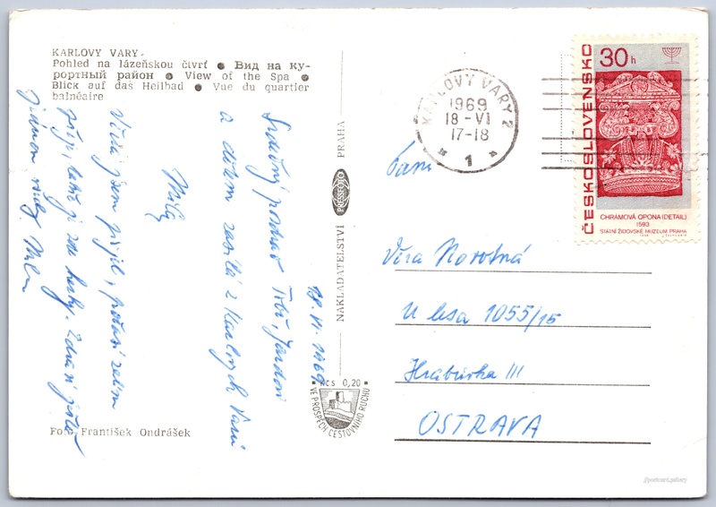 Karlovy Vary, pohled na lázeňskou čtvrť Pokud chcete vidět pohlednice ve vyšším rozlišení nebo zobrazovat jejich zadní stranu, tak se prosím nejdříve přihlašte Přihlásit Zaregistrovat KARLOVY VARY- Pohled na lázenskou čtvrt- Вид на курортный район- View of the Spa- Blick auf das Heilbad- Vue du quartier balnéaire Jazyk tištěného textu na pohlednici: čeština Libušina, Karlovy Vary, Karlovy Vary ukázat na mapě V blízkém okolí místa zobrazeného na pohlednici lze najít 62 jiných pohlednic. Zobrazit blízké pohlednice Vydavatel: PressFoto Praha (Československo) Odhadované datum vydání pohlednice: 1966 - 1969 Pomozte nám zpřesnit rok vzniku pohlednice Velikost (š x v) a tvar pohlednice: 147 x 102 mm (5.79" x 4.02"), obdélník Osoby spjaté s touto pohlednicí: František Ondrášek(Autor fotografie) Prošlá poštou:Datum na razítku: 18.6.1969Datum napsání pohledu: 18.6.1969 Ceny: Příplatek na tur. ruch: 0,20 Kčs (CSK))Vyplacené známky: 0,30 Kčs (CSK) DiskuseVložit příspěvek Přidat novou složku ... Spravovat složky ...