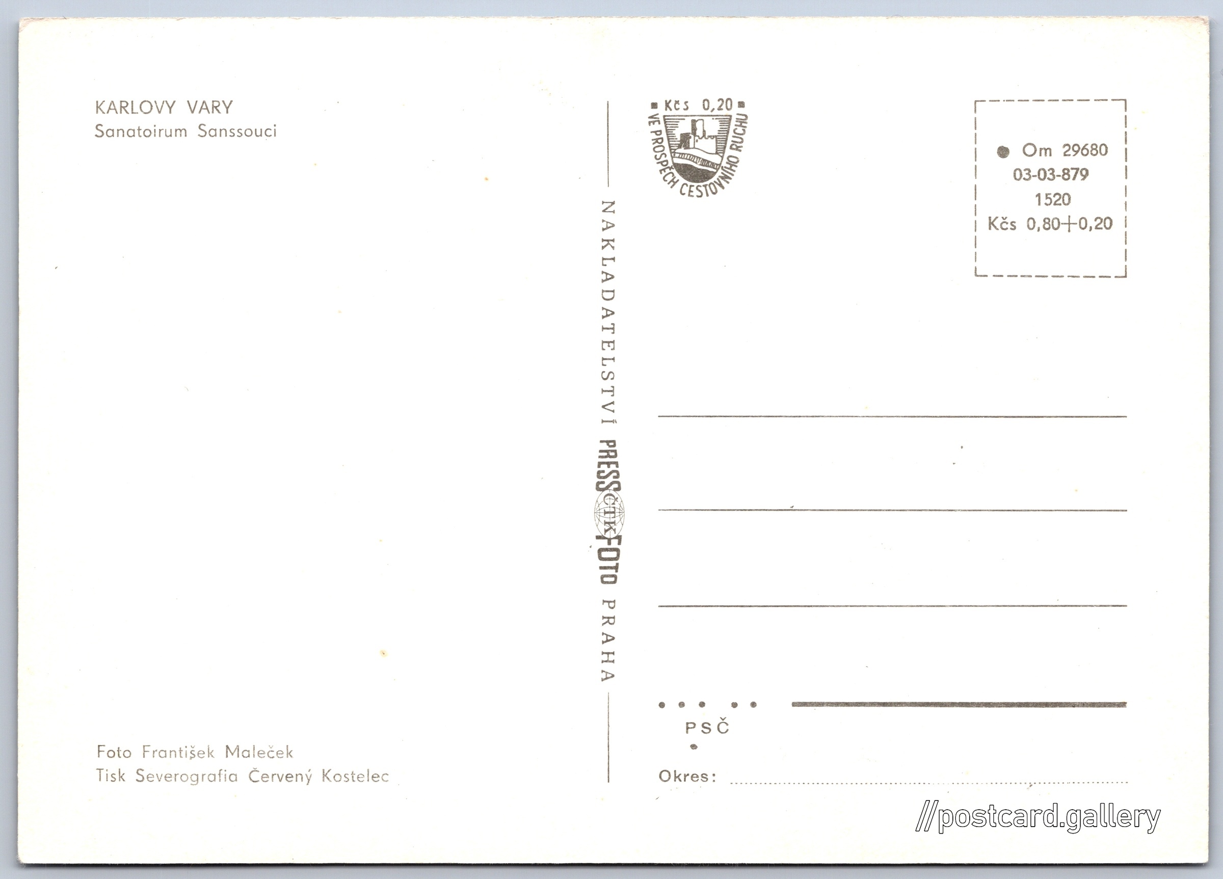 Karlovy Vary, sanatorium Sanssouci Pokud chcete vidět pohlednice ve vyšším rozlišení nebo zobrazovat jejich zadní stranu, tak se prosím nejdříve přihlašte Přihlásit Zaregistrovat KARLOVY VARYSanatoirum Sanssouci Jazyk tištěného textu na pohlednici: čeština Lázeňský hotel Sanssouci, Současná architektura, Karlovy Vary, Česko ukázat na mapě V blízkém okolí místa zobrazeného na pohlednici lze najít 62 jiných pohlednic. Zobrazit blízké pohlednice Vydavatel: PressFoto Praha (Československo) Rok vydání pohlednice: 1978 Velikost (š x v) a tvar pohlednice: 148 x 105 mm (5.83" x 4.13"), obdélník Osoby spjaté s touto pohlednicí: František Maleček(Autor fotografie) Čistá pohlednice (neprošlá poštou) Ceny: Cena pohlednice: 0,80 Kčs (CSK) (+0,20 Kčs přípl. na tur. ruch) Kódy na pohlednici: •Om 29680 03-03-879 1520 DiskuseVložit příspěvek Přidat novou složku ... Spravovat složky ...