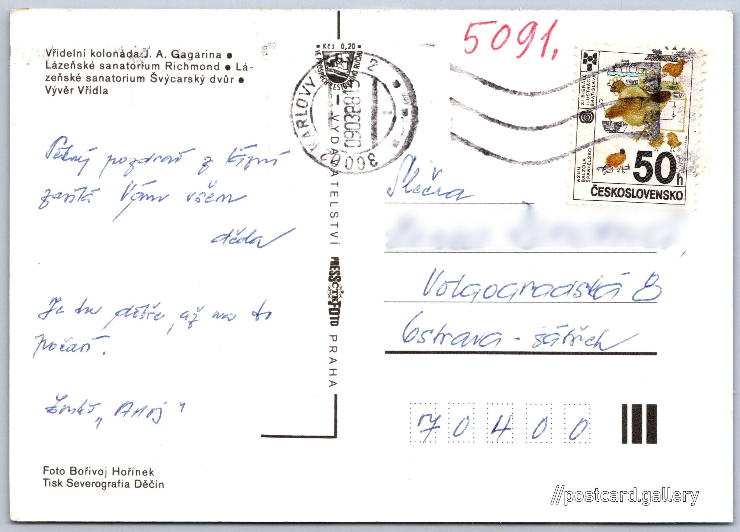 Karlovy Vary Pokud chcete vidět pohlednice ve vyšším rozlišení nebo zobrazovat jejich zadní stranu, tak se prosím nejdříve přihlašte Přihlásit Zaregistrovat Karlovy Vary - Vřídelní kolonáda J. A. Gagarina- Lázeňské sanatorium Richmond- Lázeňské sanatorium Švýcarský dvůr- Vývěr Vřídla Jazyk tištěného textu na pohlednici: čeština Karlovy Vary, Karlovy Vary ukázat na mapě Vydavatel: PressFoto Praha (Československo) Odhadované datum vydání pohlednice: 1985 - 1988 Pomozte nám zpřesnit rok vzniku pohlednice Velikost (š x v) a tvar pohlednice: 147 x 104 mm (5.79" x 4.09"), obdélník Osoby spjaté s touto pohlednicí: Bořivoj Hořínek(Autor fotografie) Jurij Gagarin(Jméno v názvu místa) Prošlá poštou:Datum na razítku: 9.3.1988 Ceny: Příplatek na tur. ruch: 0,20 Kčs (CSK))Vyplacené známky: 0,50 Kčs (CSK) DiskuseVložit příspěvek Přidat novou složku ... Spravovat složky ...
