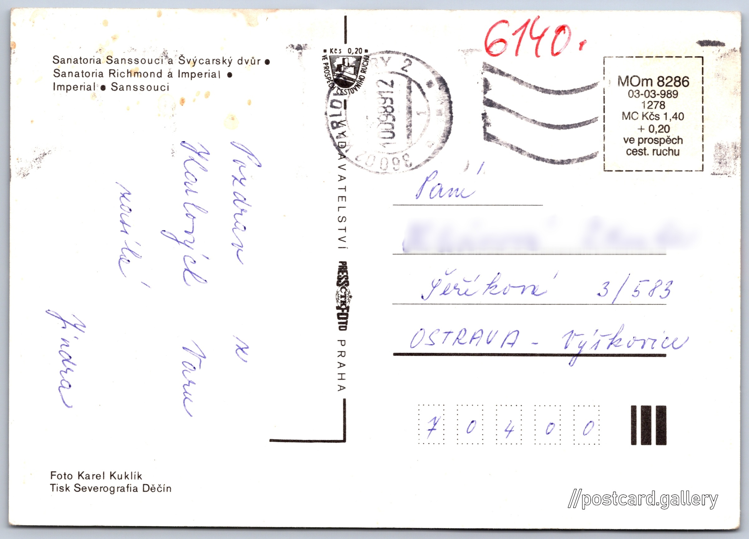 Karlovy Vary Pokud chcete vidět pohlednice ve vyšším rozlišení nebo zobrazovat jejich zadní stranu, tak se prosím nejdříve přihlašte Přihlásit Zaregistrovat Karlovy Vary - Sanatoria Sanssouci a Švýcarský dvůr- Sanatoria Richmond a Imperial- Imperial- Sanssouci Jazyk tištěného textu na pohlednici: čeština Lázeňský hotel Sanssouci, Současná architektura, Karlovy Vary, Česko ukázat na mapě Vydavatel: PressFoto Praha (Československo) Rok vydání pohlednice: 1989 Velikost (š x v) a tvar pohlednice: 148 x 105 mm (5.83" x 4.13"), obdélník Osoby spjaté s touto pohlednicí: Karel Kuklík(Autor fotografie) Prošlá poštou:Datum na razítku: 10.9.1989 Ceny: Cena pohlednice: 1,40 Kčs (CSK) (+0,20 Kčs přípl. na tur. ruch) Kódy na pohlednici: MOm 8286 03-03-989 1278 DiskuseVložit příspěvek Přidat novou složku ... Spravovat složky ...