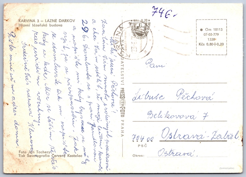 Karviná, Darkov, hlavní lázeňská budova Pokud chcete vidět pohlednice ve vyšším rozlišení nebo zobrazovat jejich zadní stranu, tak se prosím nejdříve přihlašte Přihlásit Zaregistrovat KARVINÁ - LÁZNĚ DARKOVHlavní lázeňská budova Jazyk tištěného textu na pohlednici: čeština Lázně Darkov, Karviná, Karviná ukázat na mapě V blízkém okolí místa zobrazeného na pohlednici lze najít 4 jiné pohlednice. Zobrazit blízké pohlednice Vydavatel: PressFoto Praha (Československo) Rok vydání pohlednice: 1977 Velikost (š x v) a tvar pohlednice: 148 x 105 mm (5.83" x 4.13"), obdélník Osoby spjaté s touto pohlednicí: Jan Tachezy(Autor fotografie) Prošlá poštou Ceny: Cena pohlednice: 0,80 Kčs (CSK) (+0,20 Kčs přípl. na tur. ruch) Kódy na pohlednici: •Om 18113 07-03-779 1338 DiskuseVložit příspěvek Přidat novou složku ... Spravovat složky ...