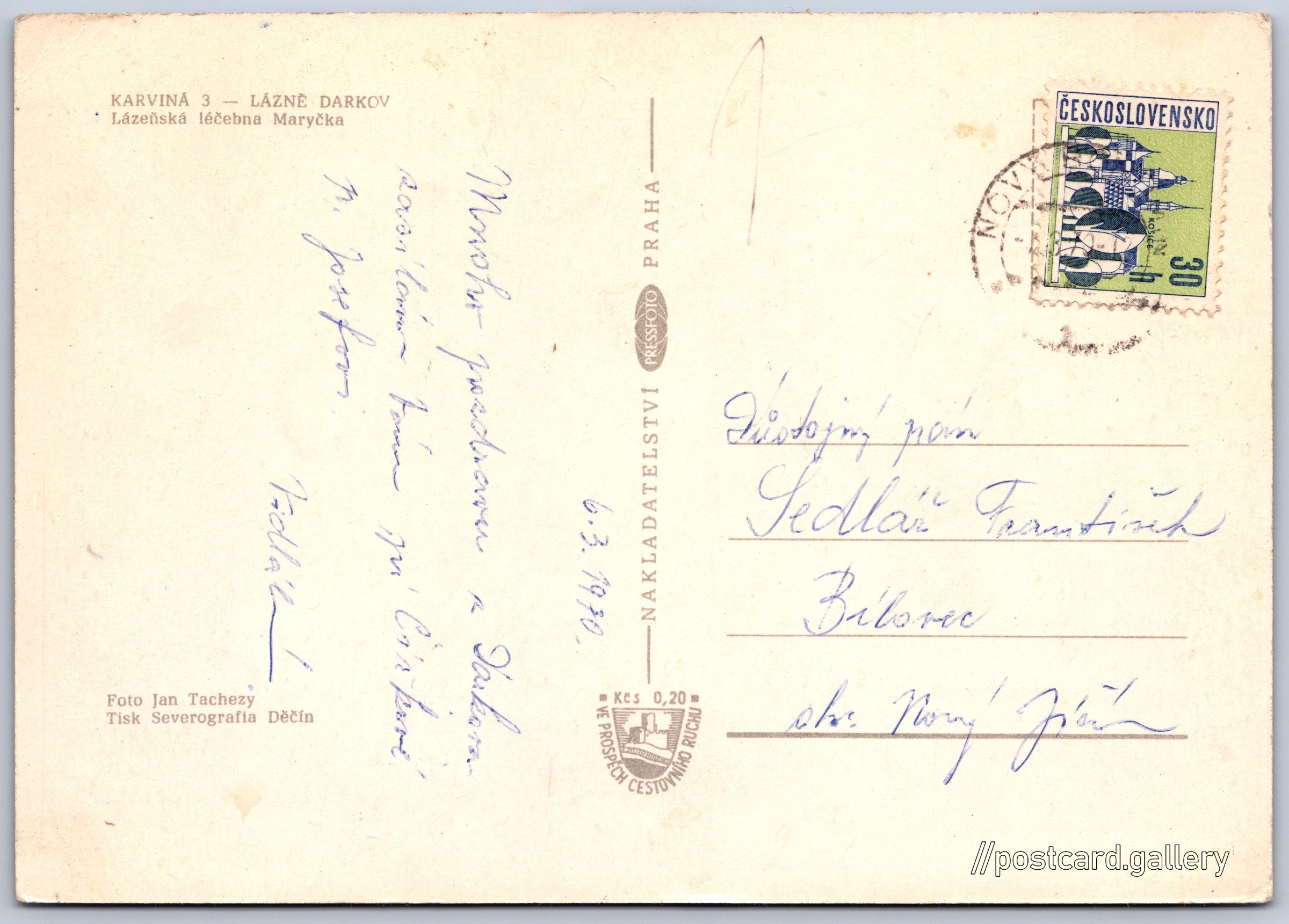 Karviná, léčebna Maryčka Pokud chcete vidět pohlednice ve vyšším rozlišení nebo zobrazovat jejich zadní stranu, tak se prosím nejdříve přihlašte Přihlásit Zaregistrovat KARVINÁ 3 - LÁZNĚ DARKOVLázeňská léčebna Maryčka Jazyk tištěného textu na pohlednici: čeština Lázně Darkov, Karviná, Karviná ukázat na mapě V blízkém okolí místa zobrazeného na pohlednici lze najít 4 jiné pohlednice. Zobrazit blízké pohlednice Vydavatel: PressFoto Praha (Československo) Datum vydání není známo Pomozte nám odhadnout datum vzniku pohlednice Velikost (š x v) a tvar pohlednice: 149 x 105 mm (5.87" x 4.13"), obdélník Osoby spjaté s touto pohlednicí: Jan Tachezy(Autor fotografie) Prošlá poštou:Datum napsání pohledu: 6.3.1970 Ceny: Příplatek na tur. ruch: 0,20 Kčs (CSK))Vyplacené známky: 0,30 Kčs (CSK) DiskuseVložit příspěvek Přidat novou složku ... Spravovat složky ...