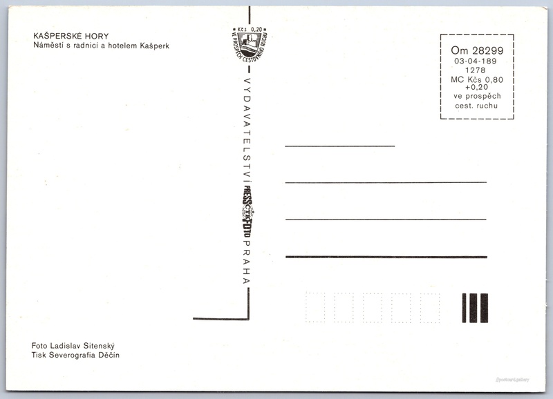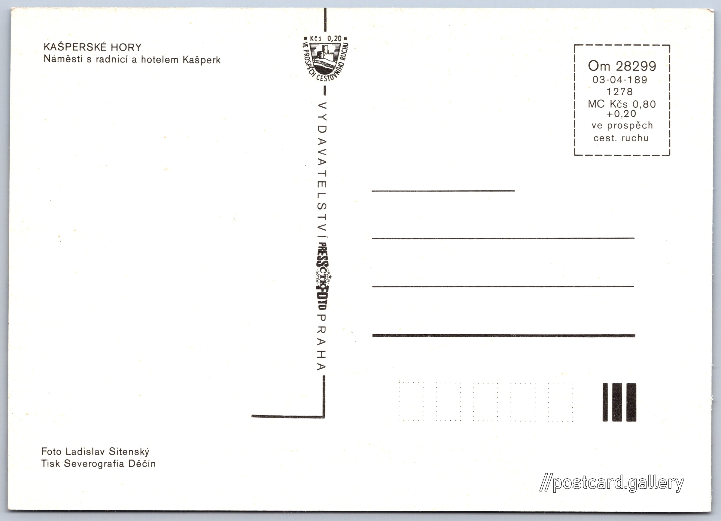 Kašperské Hory, náměstí Pokud chcete vidět pohlednice ve vyšším rozlišení nebo zobrazovat jejich zadní stranu, tak se prosím nejdříve přihlašte Přihlásit Zaregistrovat KAŠPERSKÉ HORYNáměstí s radnicí a hotelem Kašperk Jazyk tištěného textu na pohlednici: čeština Radnice Kašperské Hory, Historická budova, Náměstí 1, Kašperské Hory, Česko ukázat na mapě V blízkém okolí místa zobrazeného na pohlednici lze najít 7 jiných pohlednic. Zobrazit blízké pohlednice Vydavatel: PressFoto Praha (Československo) Rok vydání pohlednice: 1981 Velikost (š x v) a tvar pohlednice: 148 x 105 mm (5.83" x 4.13"), obdélník Osoby spjaté s touto pohlednicí: Ladislav Sitenský(Autor fotografie) Čistá pohlednice (neprošlá poštou) Ceny: Cena pohlednice: 0,80 Kčs (CSK) (+0,20 Kčs přípl. na tur. ruch) Kódy na pohlednici: Om 28299 03-04-189 1278 DiskuseVložit příspěvek Přidat novou složku ... Spravovat složky ...