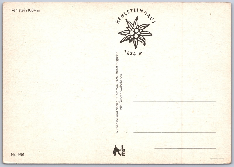 Kehlsteinhaus, Orlí hnízdo Pokud chcete vidět pohlednice ve vyšším rozlišení nebo zobrazovat jejich zadní stranu, tak se prosím nejdříve přihlašte Přihlásit Zaregistrovat Liftkabine von 1938Eingangstunnel 124 m.Eingang zum Lift Kehlstein 1834 m Jazyk tištěného textu na pohlednici: němčina Dalsenwinkelstraße ukázat na mapě Vydavatel: H. Ammon (Německo) Datum vydání není známo Pomozte nám odhadnout datum vzniku pohlednice Velikost (š x v) a tvar pohlednice: 147 x 103 mm (5.79" x 4.06"), obdélník Čistá pohlednice (neprošlá poštou) Kódy na pohlednici: 936 DiskuseVložit příspěvek Přidat novou složku ... Spravovat složky ...