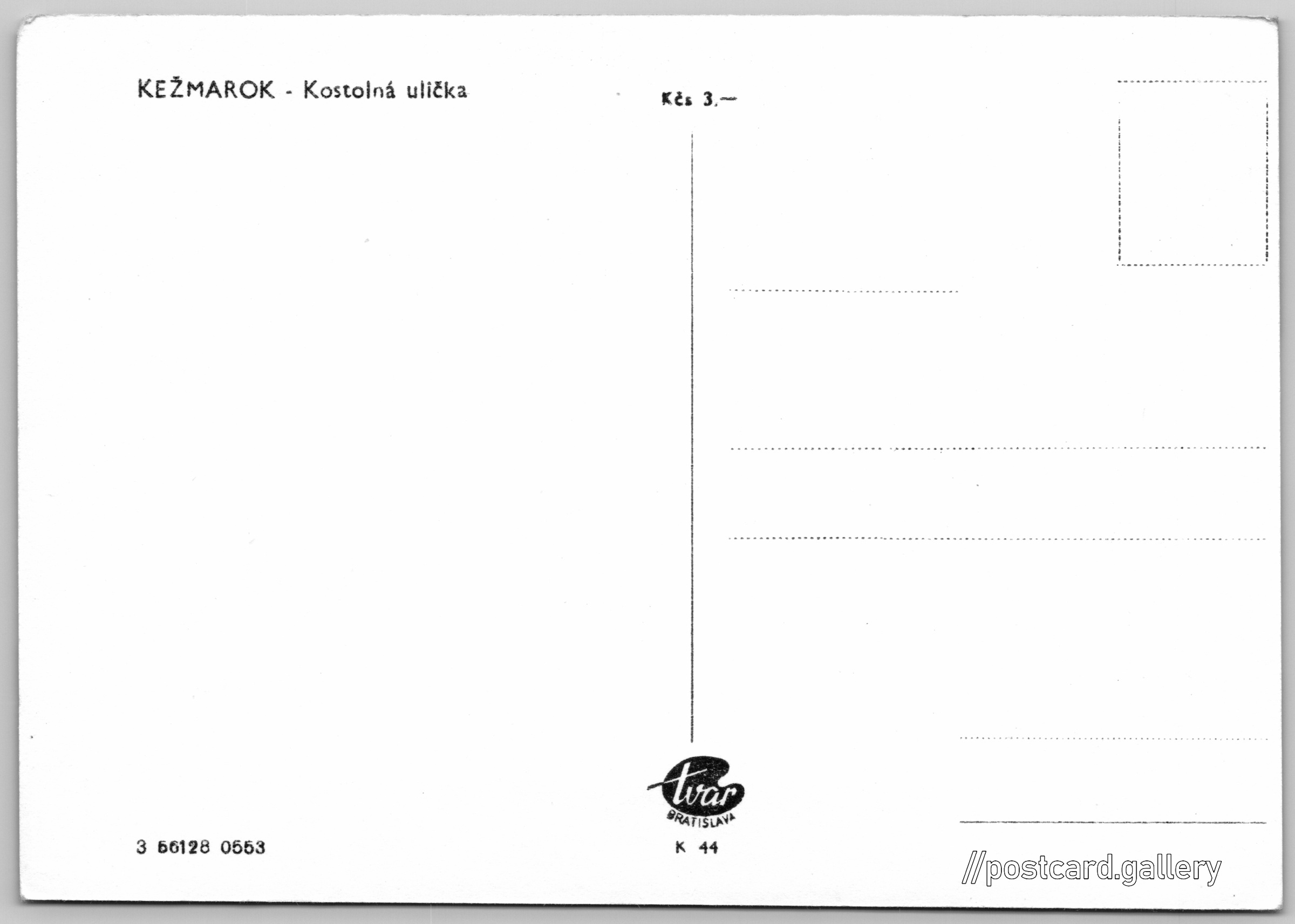 Kežmarok, Kostelní ulička Pokud chcete vidět pohlednice ve vyšším rozlišení nebo zobrazovat jejich zadní stranu, tak se prosím nejdříve přihlašte Přihlásit Zaregistrovat KEŽMAROK - Kostolná ulička Jazyk tištěného textu na pohlednici: slovenština Hlavné námestie 103/33 ukázat na mapě V blízkém okolí místa zobrazeného na pohlednici lze najít 1 jinou pohlednici. Zobrazit blízké pohlednice Vydavatel: Tvar Bratislava (Československo) Rok vydání pohlednice: květen, 1953 Velikost (š x v) a tvar pohlednice: 148 x 104 mm (5.83" x 4.09"), obdélník Čistá pohlednice (neprošlá poštou) Ceny: Cena pohlednice: 3,00 Kčs (CSK) Kódy na pohlednici: 3 66128 0553 K 44 DiskuseVložit příspěvek Přidat novou složku ... Spravovat složky ...