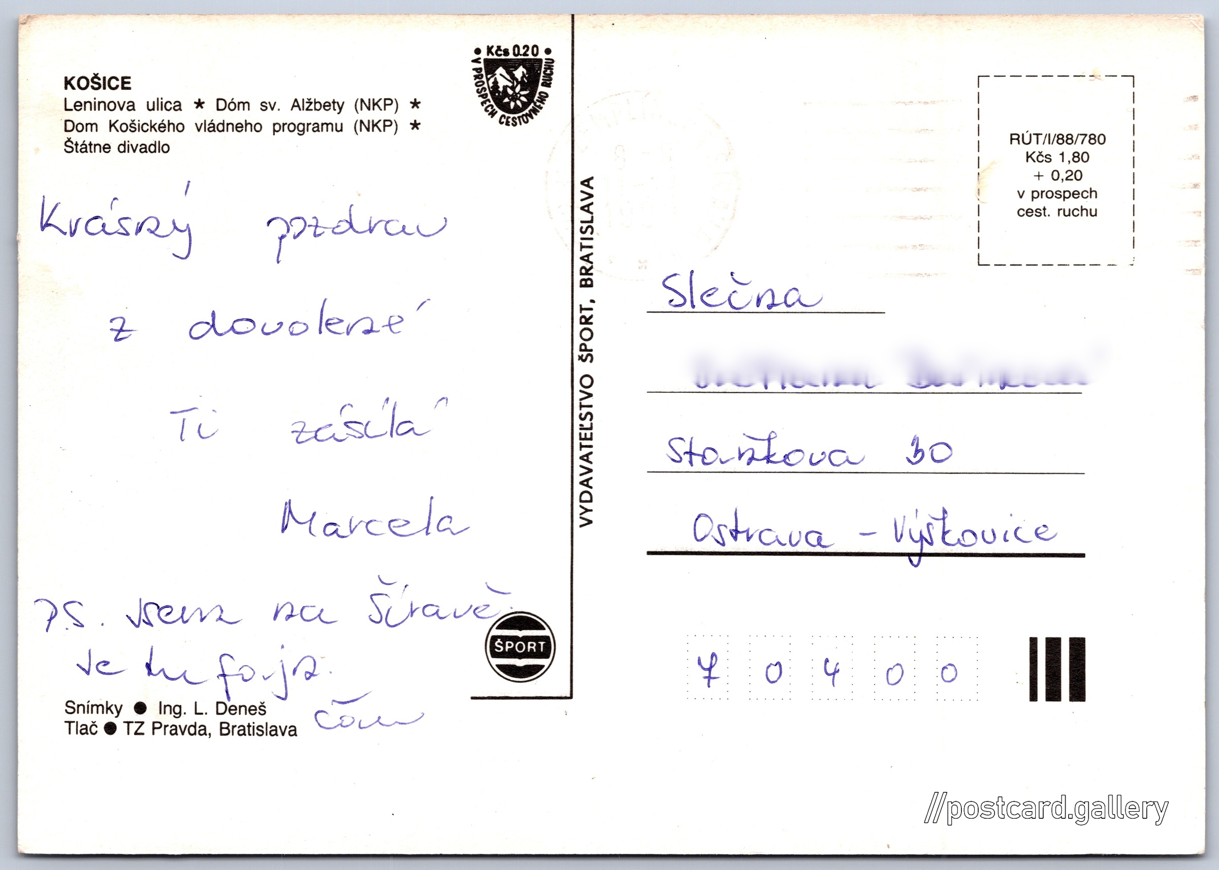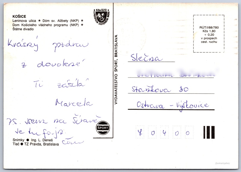 Košice Pokud chcete vidět pohlednice ve vyšším rozlišení nebo zobrazovat jejich zadní stranu, tak se prosím nejdříve přihlašte Přihlásit Zaregistrovat Košice KOŠICE- Leninova ulica- Dóm sv. Alžbety (NKP)- Dom Košického vládneho programu (NKP)- Štátne divadlo Jazyk tištěného textu na pohlednici: slovenština Námestie slobody ukázat na mapě Vydavatel: Vydavateľstvo Šport, Bratislava (Slovensko) Rok vydání pohlednice: 1988 Velikost (š x v) a tvar pohlednice: 147 x 105 mm (5.79" x 4.13"), obdélník Osoby spjaté s touto pohlednicí: Ing. Ladislav Deneš(Autor fotografie) Prošlá poštou Ceny: Cena pohlednice: 1,80 Kčs (CSK) (+0,20 Kčs přípl. na tur. ruch) Kódy na pohlednici: RÚT/V/88/780 DiskuseVložit příspěvek Přidat novou složku ... Spravovat složky ...