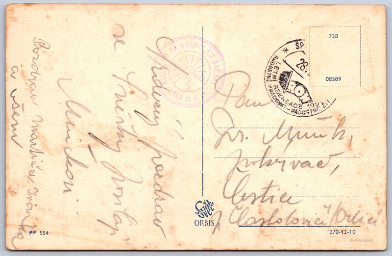 Krakonošův pozdrav ze Sněžky Pokud chcete vidět pohlednice ve vyšším rozlišení nebo zobrazovat jejich zadní stranu, tak se prosím nejdříve přihlašte Přihlásit Zaregistrovat Krakonošův pozdrav ze Sněžky Jazyk tištěného textu na pohlednici: čeština Vydavatel: Nakladatelství Orbis (Československo) Datum vydání není známo Pomozte nám odhadnout datum vzniku pohlednice Velikost (š x v) a tvar pohlednice: 139 x 90 mm (5.47" x 3.54"), obdélník Prošlá poštou Kódy na pohlednici: FP 554 728 08589 270-12-10 DiskuseVložit příspěvek Přidat novou složku ... Spravovat složky ...