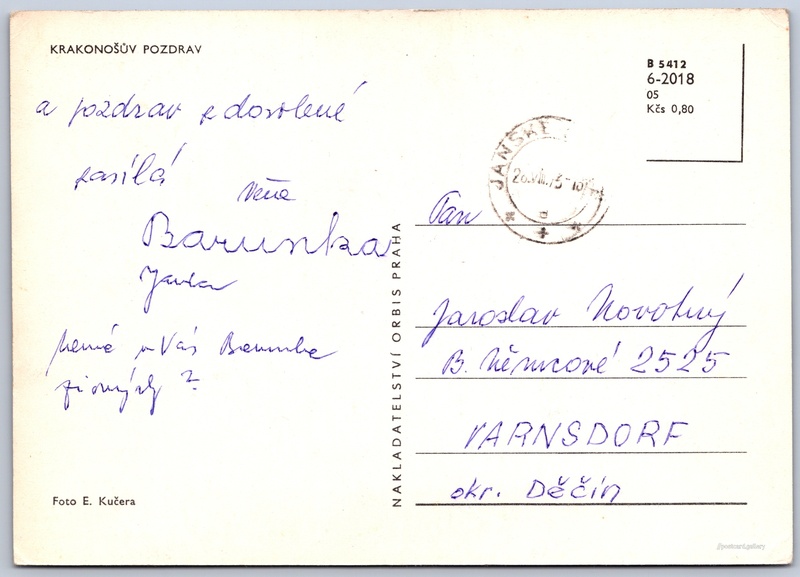 Krakonošův pozdrav 4/5 Pokud chcete vidět pohlednice ve vyšším rozlišení nebo zobrazovat jejich zadní stranu, tak se prosím nejdříve přihlašte Přihlásit Zaregistrovat KRAKONOŠŮV POZDRAV Jazyk tištěného textu na pohlednici: čeština Vydavatel: Nakladatelství Orbis (Československo) Odhadované datum vydání pohlednice: 1970 - 1973 Pomozte nám zpřesnit rok vzniku pohlednice Velikost (š x v) a tvar pohlednice: 149 x 106 mm (5.87" x 4.17"), obdélník Osoby spjaté s touto pohlednicí: Eman Kučera(Autor fotografie) Krakonoš(Obsah pohlednice) Prošlá poštou:Datum na razítku: 28.8.1973 Ceny: Cena pohlednice: 0,80 Kčs (CSK) Kódy na pohlednici: B 5412 6-2018 05 DiskuseVložit příspěvek Přidat novou složku ... Spravovat složky ...