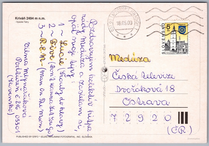 Kriváň, Vysoké Tatry Pokud chcete vidět pohlednice ve vyšším rozlišení nebo zobrazovat jejich zadní stranu, tak se prosím nejdříve přihlašte Přihlásit Zaregistrovat Kriváň 2494m Kriváň 2494 m n.m.- Vysoké Tatry Jazyk tištěného textu na pohlednici: slovenština Kriváň (2494 m), Hora, výškový bod, Vysoké Tatry - Štrbské Pleso, Slovensko ukázat na mapě V blízkém okolí místa zobrazeného na pohlednici lze najít 37 jiných pohlednic. Zobrazit blízké pohlednice Vydavatel: Artstudio Erfo (Slovensko) Odhadované datum vydání pohlednice: 1997 - 2000 Pomozte nám zpřesnit rok vzniku pohlednice Velikost (š x v) a tvar pohlednice: 152 x 104 mm (5.98" x 4.09"), obdélník Prošlá poštou:Datum na razítku: 18.5.2000 Ceny: Vyplacené známky: 5,00 Sk (SKK) DiskuseVložit příspěvek Přidat novou složku ... Spravovat složky ...