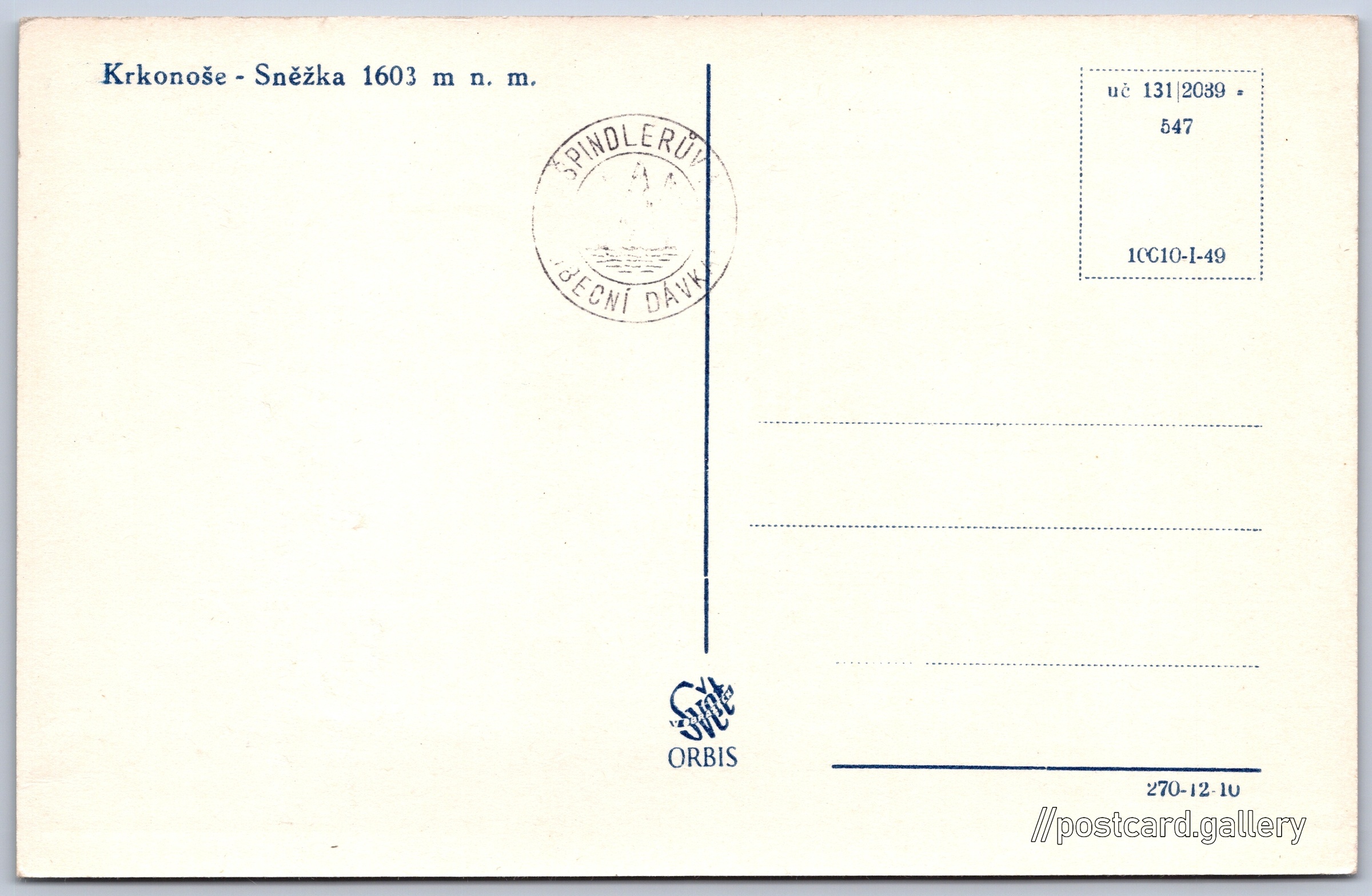 Krkonoš, Sněžka Pokud chcete vidět pohlednice ve vyšším rozlišení nebo zobrazovat jejich zadní stranu, tak se prosím nejdříve přihlašte Přihlásit Zaregistrovat Krkonoše - Sněžka 1603 m n. m. Jazyk tištěného textu na pohlednici: čeština Pec pod Sněžkou, Trutnov ukázat na mapě V blízkém okolí místa zobrazeného na pohlednici lze najít 42 jiných pohlednic. Zobrazit blízké pohlednice Vydavatel: Nakladatelství Orbis (Československo) Datum vydání není známo Pomozte nám odhadnout datum vzniku pohlednice Velikost (š x v) a tvar pohlednice: 140 x 90 mm (5.51" x 3.54"), obdélník Čistá pohlednice (neprošlá poštou) Kódy na pohlednici: uc 131|2039 547 10010-I-49 270-12-10 1603 DiskuseVložit příspěvek Přidat novou složku ... Spravovat složky ...