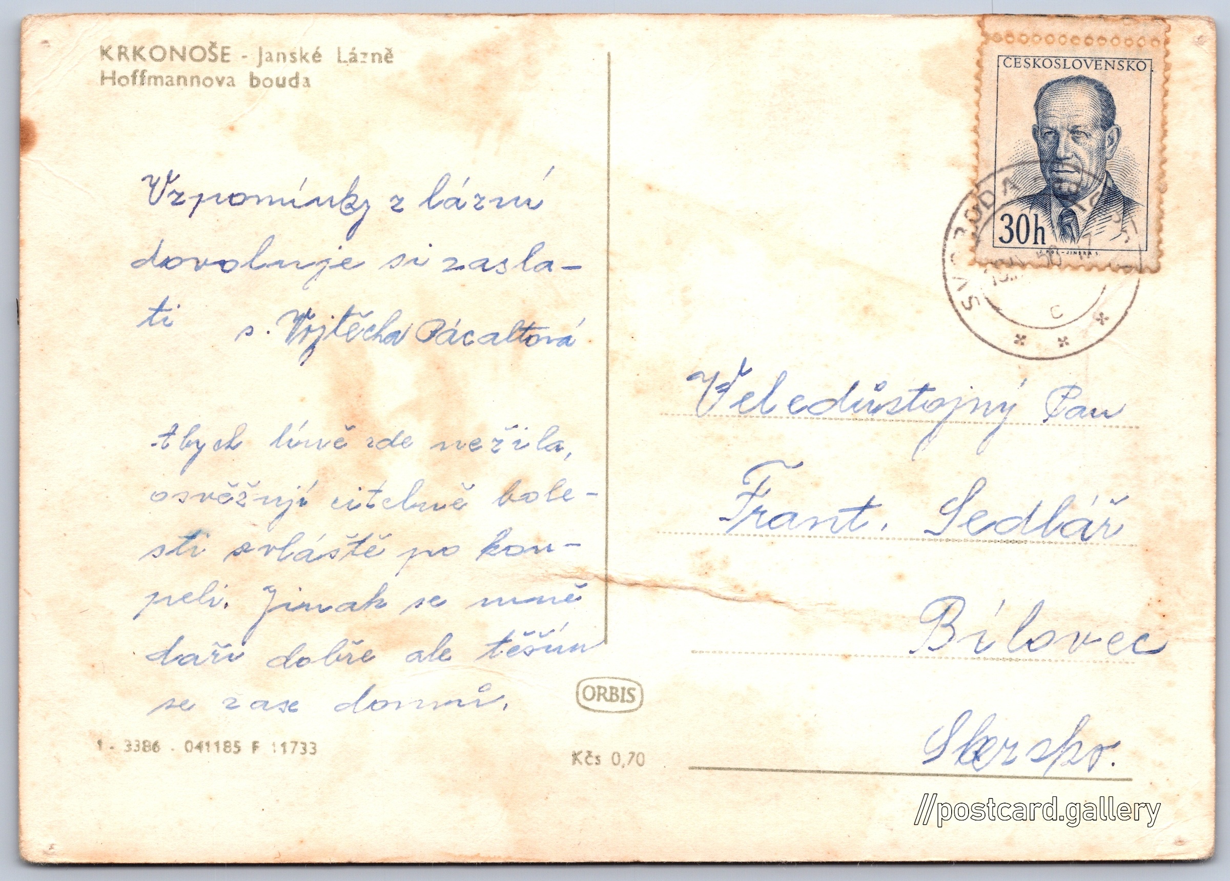 Krkonoše, Hoffmannova bouda Pokud chcete vidět pohlednice ve vyšším rozlišení nebo zobrazovat jejich zadní stranu, tak se prosím nejdříve přihlašte Přihlásit Zaregistrovat KRKONOŠE - Janské LázněHoffmannova bouda Jazyk tištěného textu na pohlednici: čeština Hoffmanova bouda, Krkonošská 125, Janské Lázně, Česko ukázat na mapě V blízkém okolí místa zobrazeného na pohlednici lze najít 18 jiných pohlednic. Zobrazit blízké pohlednice Vydavatel: Nakladatelství Orbis (Československo) Odhadované datum vydání pohlednice: 1955 - 1958 Pomozte nám zpřesnit rok vzniku pohlednice Velikost (š x v) a tvar pohlednice: 147 x 103 mm (5.79" x 4.06"), obdélník Prošlá poštou Ceny: Cena pohlednice: 0,70 Kčs (CSK)Vyplacené známky: 0,30 Kčs (CSK) Kódy na pohlednici: 1-3386 041185 F 11733 DiskuseVložit příspěvek Přidat novou složku ... Spravovat složky ...