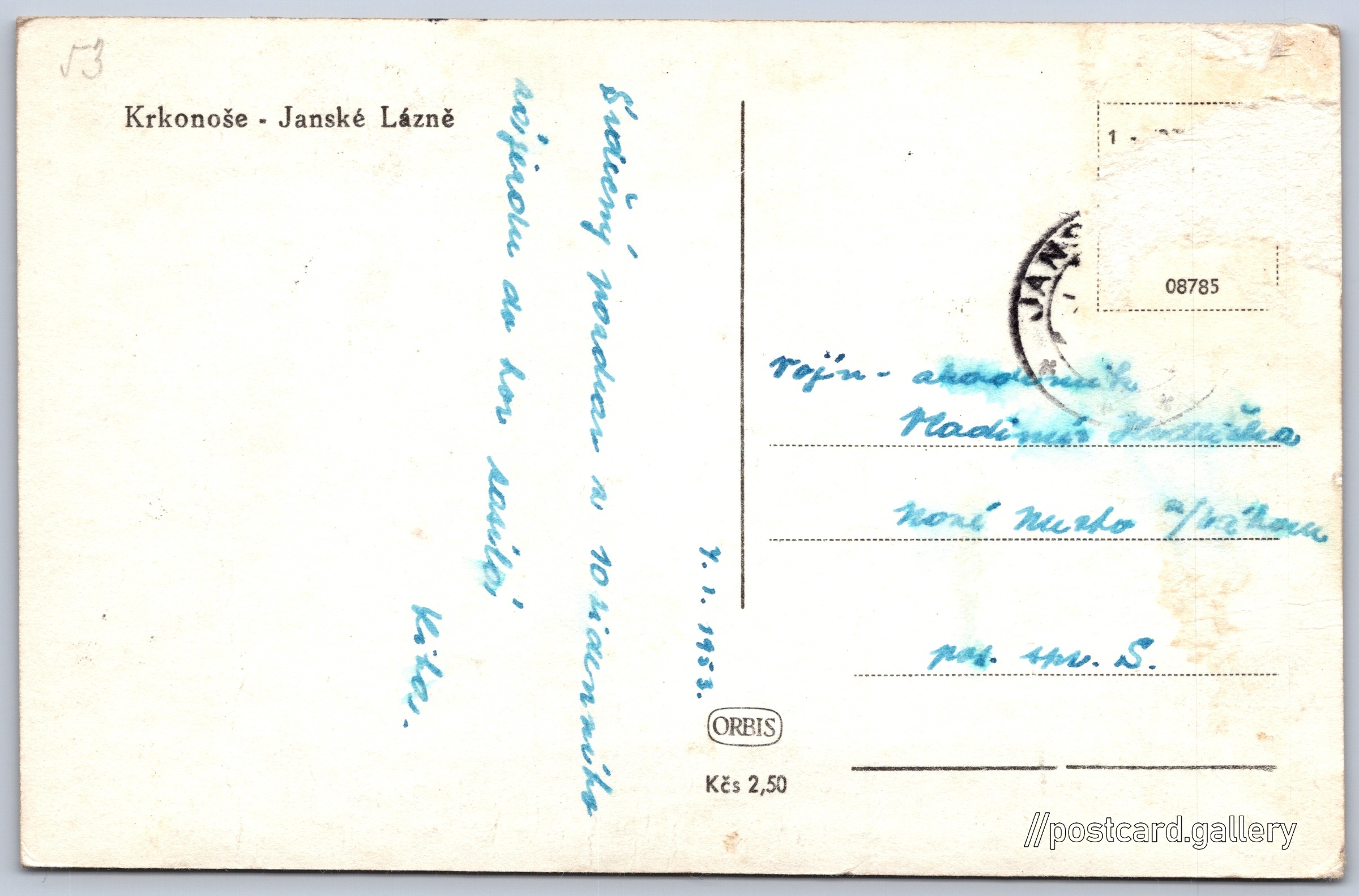 Krkonoše, Janské Lázně Pokud chcete vidět pohlednice ve vyšším rozlišení nebo zobrazovat jejich zadní stranu, tak se prosím nejdříve přihlašte Přihlásit Zaregistrovat Krkonoše - Janské Lázně Jazyk tištěného textu na pohlednici: čeština Janské Lázně, Město, Česko ukázat na mapě Vydavatel: Nakladatelství Orbis (Československo) Odhadované datum vydání pohlednice: 1950 - 1953 Pomozte nám zpřesnit rok vzniku pohlednice Velikost (š x v) a tvar pohlednice: 140 x 91 mm (5.51" x 3.58"), obdélník Prošlá poštou:Datum napsání pohledu: 7.1.1953 Ceny: Cena pohlednice: 2,50 Kčs (CSK) Kódy na pohlednici: 08785 DiskuseVložit příspěvek Přidat novou složku ... Spravovat složky ...