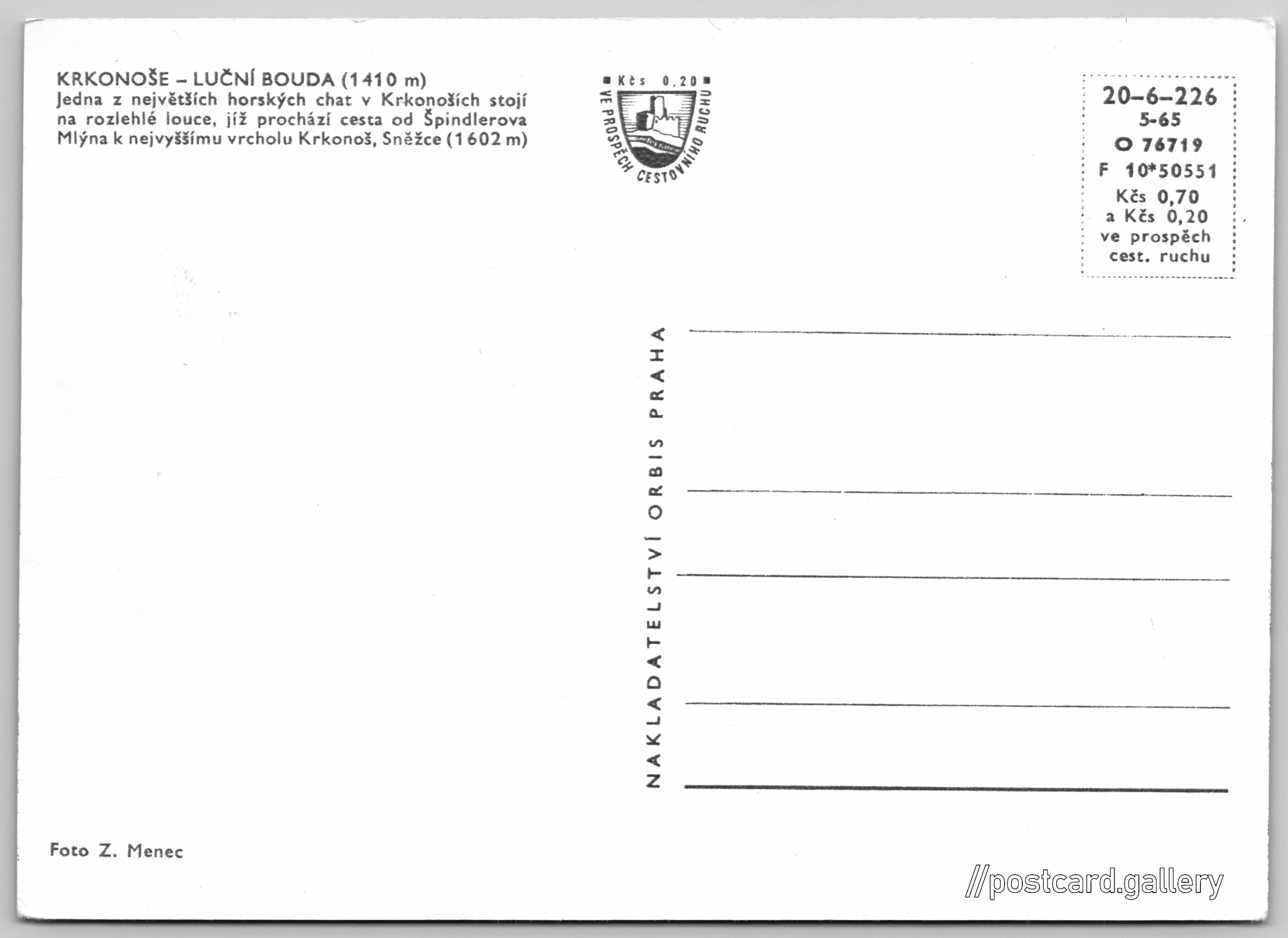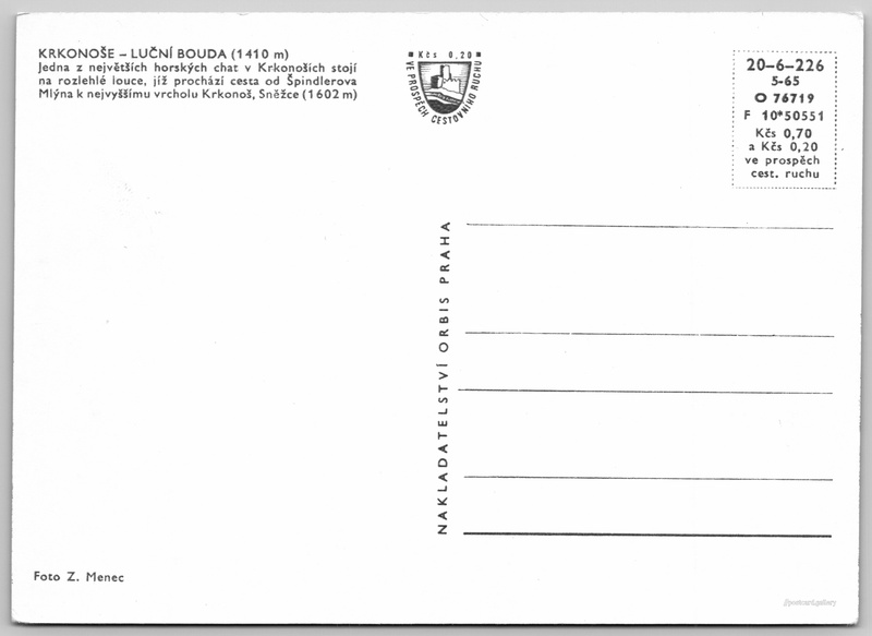 Krkonoše, Luční bouda Pokud chcete vidět pohlednice ve vyšším rozlišení nebo zobrazovat jejich zadní stranu, tak se prosím nejdříve přihlašte Přihlásit Zaregistrovat KRKONOŠE - LUČNÍ BOUDA (1410 m)Jedna z největších horských chat v Krkonoších stojí na rozlehlé louce, jíž prochází cesta od Špindlerova Mlýna k nejvyššímu vrcholu Krkonoš, Sněžce (1602 m) Jazyk tištěného textu na pohlednici: čeština Pec pod Sněžkou 203, Pec pod Sněžkou, 542 21, Trutnov ukázat na mapě Vydavatel: Nakladatelství Orbis (Československo) Rok vydání pohlednice: květen, 1965 Velikost (š x v) a tvar pohlednice: 144 x 103 mm (5.67" x 4.06"), obdélník Osoby spjaté s touto pohlednicí: Zdeněk Menec(Autor fotografie) Čistá pohlednice (neprošlá poštou) Ceny: Cena pohlednice: 0,70 Kčs (CSK) (+0,20 Kčs přípl. na tur. ruch) Kódy na pohlednici: 20-6-226 5-65 O 76719 F 10*50551 DiskuseVložit příspěvek Přidat novou složku ... Spravovat složky ...