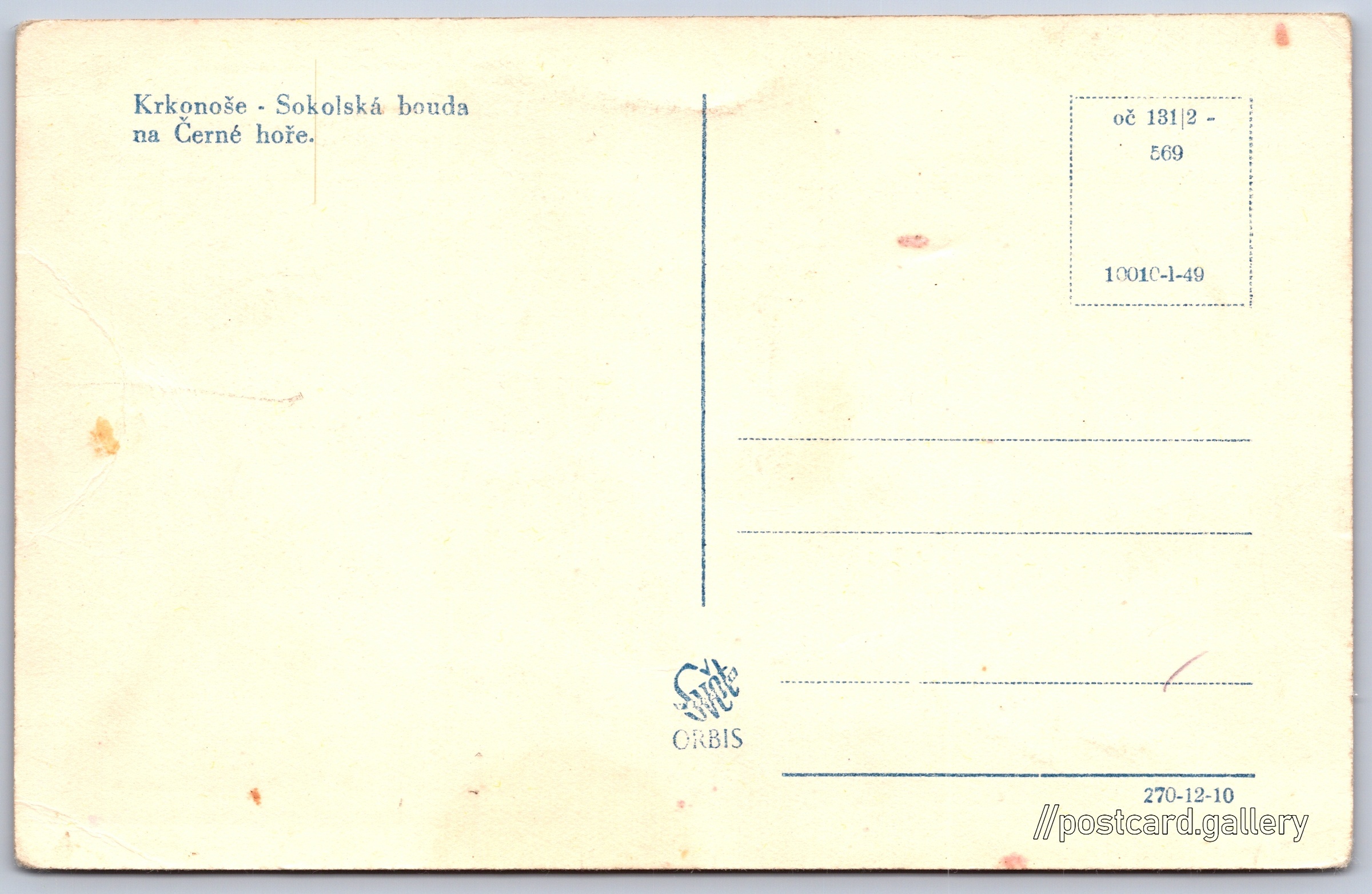 Krkonoše, Sokolská bouda Pokud chcete vidět pohlednice ve vyšším rozlišení nebo zobrazovat jejich zadní stranu, tak se prosím nejdříve přihlašte Přihlásit Zaregistrovat Krkonoše - Sokolská boudana Černé hoře. Jazyk tištěného textu na pohlednici: čeština Horská 172, Janské Lázně, 542 25, Trutnov ukázat na mapě V blízkém okolí místa zobrazeného na pohlednici lze najít 20 jiných pohlednic. Zobrazit blízké pohlednice Vydavatel: Nakladatelství Orbis (Československo) Datum vydání není známo Pomozte nám odhadnout datum vzniku pohlednice Velikost (š x v) a tvar pohlednice: 141 x 90 mm (5.55" x 3.54"), obdélník Čistá pohlednice (neprošlá poštou) Kódy na pohlednici: oc 131|2 569 10010-1-49 270-12-10 DiskuseVložit příspěvek Přidat novou složku ... Spravovat složky ...