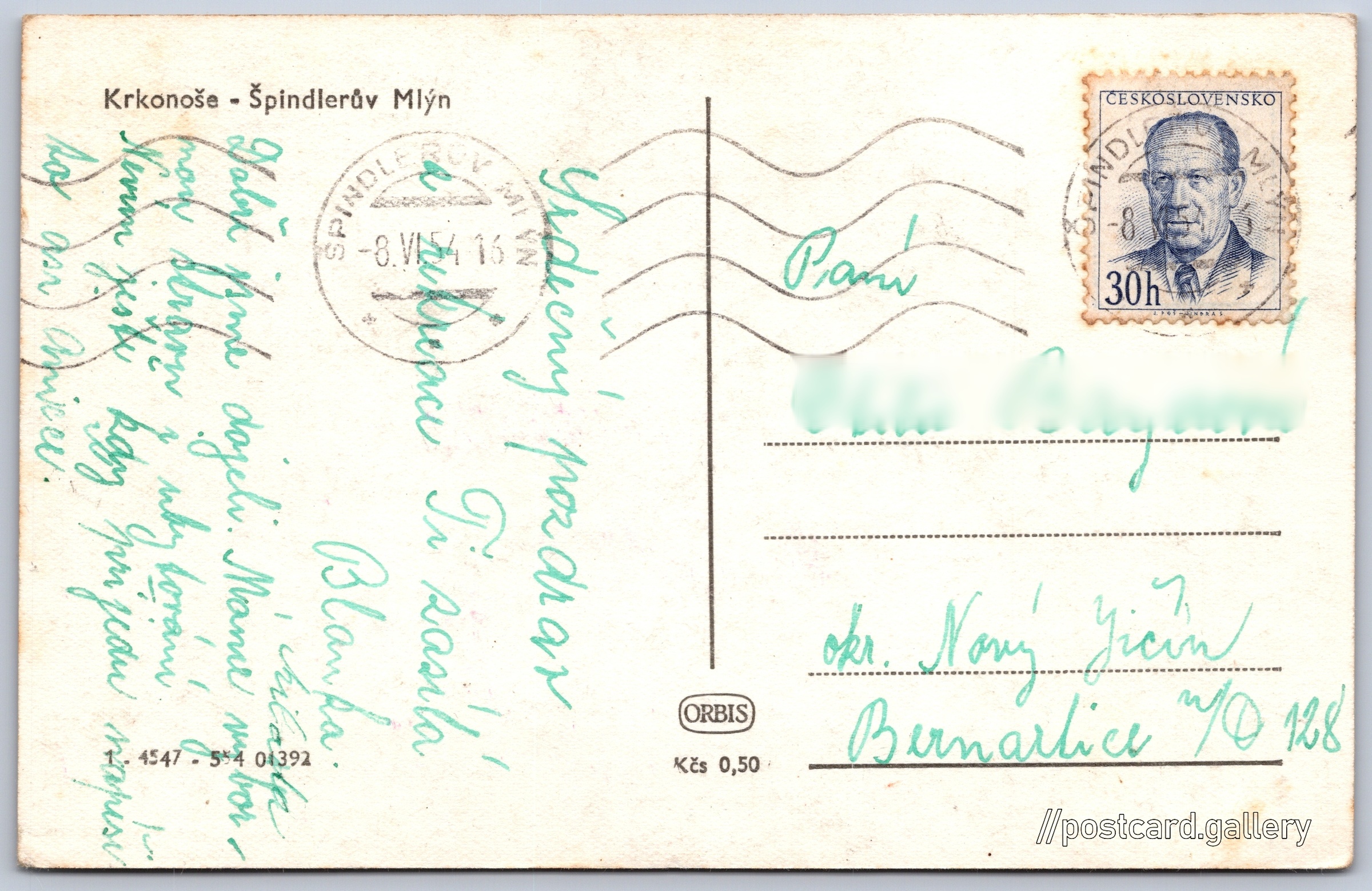 Krkonoše, Špindlerův Mlýn Pokud chcete vidět pohlednice ve vyšším rozlišení nebo zobrazovat jejich zadní stranu, tak se prosím nejdříve přihlašte Přihlásit Zaregistrovat Krkonoše - Špindlerův Mlýn Jazyk tištěného textu na pohlednici: čeština Špindlerův Mlýn, Město, Česko ukázat na mapě Vydavatel: Nakladatelství Orbis (Československo) Rok vydání pohlednice: květen, 1954 Velikost (š x v) a tvar pohlednice: 139 x 90 mm (5.47" x 3.54"), obdélník Prošlá poštou:Datum na razítku: 8.6.1954 Ceny: Cena pohlednice: 0,50 Kčs (CSK)Vyplacené známky: 0,30 Kčs (CSK) Kódy na pohlednici: 1-4547 554 01392 DiskuseVložit příspěvek Přidat novou složku ... Spravovat složky ...