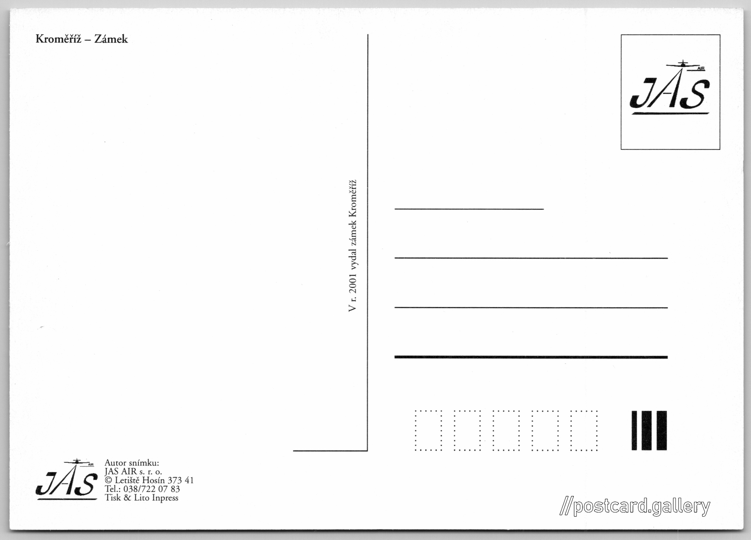 Kroměříž, zámek Pokud chcete vidět pohlednice ve vyšším rozlišení nebo zobrazovat jejich zadní stranu, tak se prosím nejdříve přihlašte Přihlásit Zaregistrovat Zámek Kroměříž Kroměříž - Zámek Jazyk tištěného textu na pohlednici: čeština Kroměříž, Kroměříž ukázat na mapě Vydavatel: Zámek Kroměříž (Česko)JAS Air CZ (Česko) Rok vydání pohlednice: 2001 Velikost (š x v) a tvar pohlednice: 147 x 105 mm (5.79" x 4.13"), obdélník Čistá pohlednice (neprošlá poštou) DiskuseVložit příspěvek Přidat novou složku ... Spravovat složky ...
