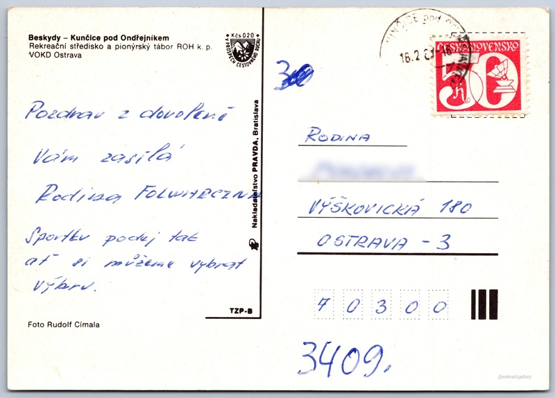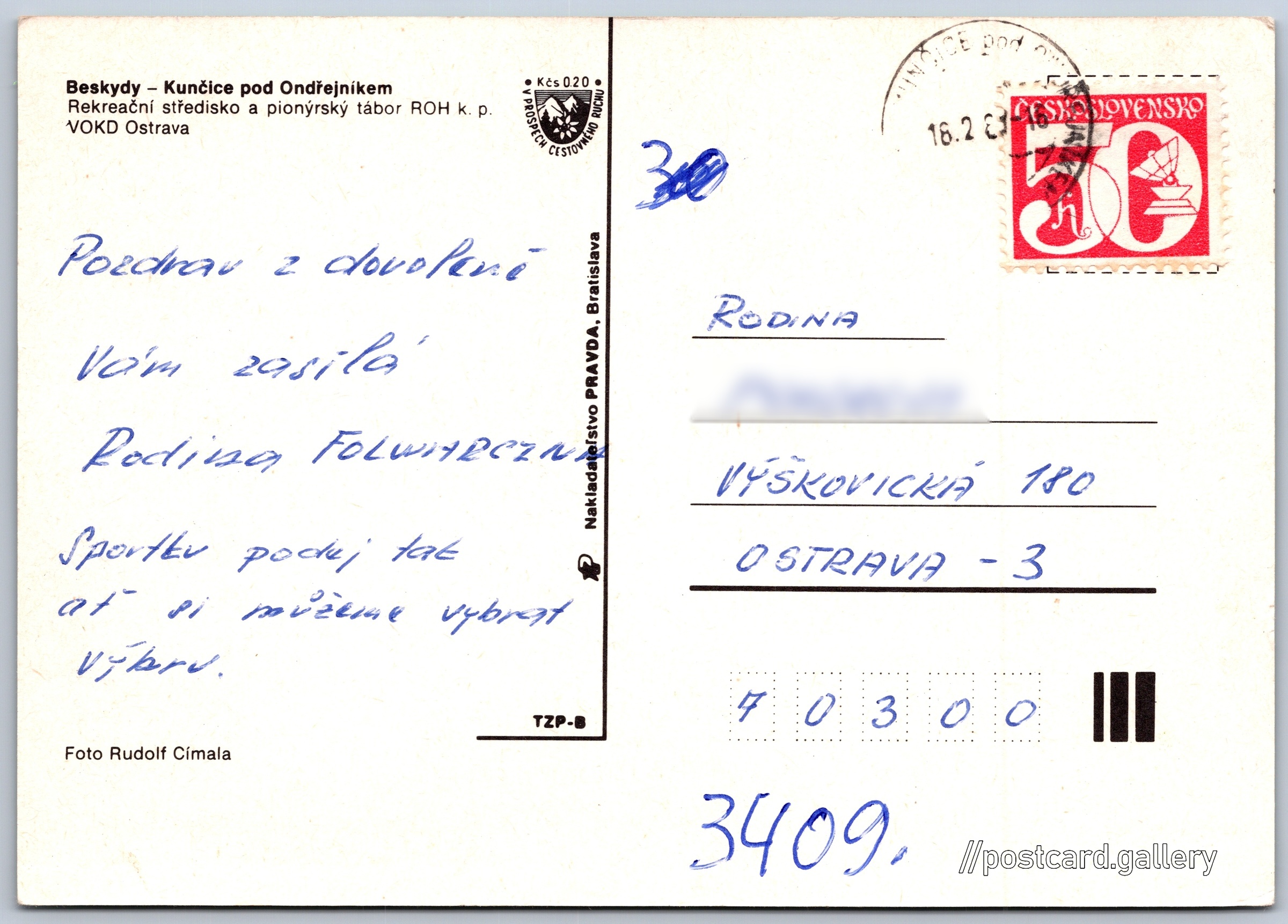 Kunčice pod Ondřejníkem, rekreační středisko VOKD Pokud chcete vidět pohlednice ve vyšším rozlišení nebo zobrazovat jejich zadní stranu, tak se prosím nejdříve přihlašte Přihlásit Zaregistrovat Kunčice pod OndřejníkemVOKD Beskydy - Kunčice pod OndřejníkemRekreační středisko a pionýrský tábor ROH k. p. VOKD Ostrava Jazyk tištěného textu na pohlednici: čeština Kunčice pod Ondřejníkem 8, 739 13 Kunčice pod Ondřejníkem, Czechia ukázat na mapě Vydavatel: Nakladateľstvo PRAVDA, Bratislava (Československo) Datum vydání není známo Pomozte nám odhadnout datum vzniku pohlednice Velikost (š x v) a tvar pohlednice: 147 x 104 mm (5.79" x 4.09"), obdélník Osoby spjaté s touto pohlednicí: Rudolf Cimala(Autor fotografie) Prošlá poštou Ceny: Příplatek na tur. ruch: 0,20 Kčs (CSK))Vyplacené známky: 0,50 Kčs (CSK) DiskuseVložit příspěvek Přidat novou složku ... Spravovat složky ...